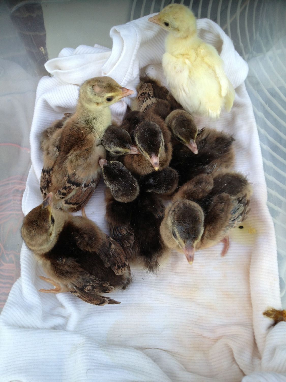 Eggcellent Well worth the extra cost....I only have all partially-pearled, non-pearled and a few pure White birds in this latest flock... my fully-pearled adults are the variety that hatch out the teddy bear keets with the blended down. There is one little guy in there somewhere that might be a heavily Pied Buff Dundotte with blended down, but it could be a heavily Pied Pastel. Not sure but I hope it is, it will be my first non-pearled keet for the season (and one in a new color). I'll know in a couple weeks when it feathers out.