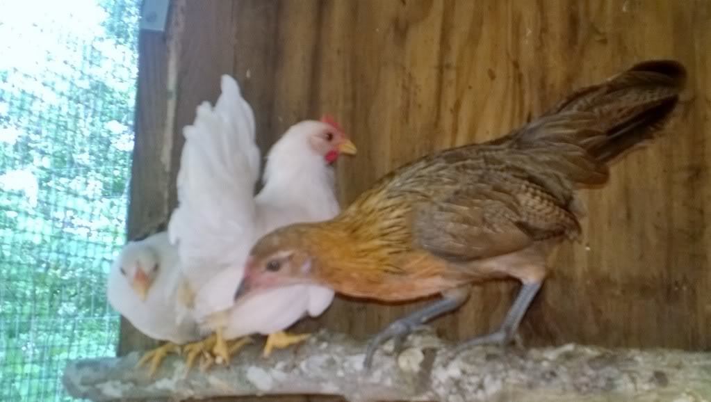 White Japanese and golden Phoenix banties, they're older now and laying. This was the only picture I could find of the Japs.