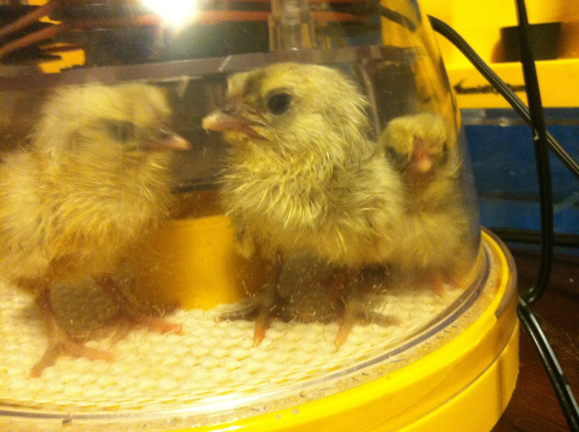 now it's happily chirping and fluffing up with its siblings. Note: if you decide to do yhis, take care not to get the nostrils wet - and have a dry towel handy. I used a cotton ball soaked in warm water to help wash the stuff off. As of this morning, I have 4 hatched and 3 pipped out of 8 eggs that went into lockdown. And I also have 14 wheaten/blue wheaten ameraucanas in the bator on day 13 - all were looking great on day 12. Yay! Here are 3 in a separate bator drying: