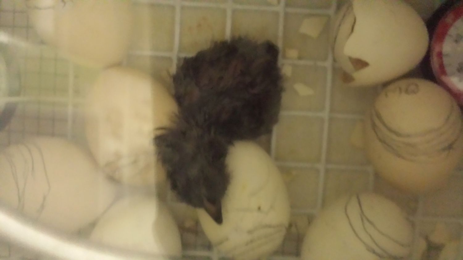 Well, we have one internal pip, two external pips and one fully hatched chick! It can't seem to get one of it's feet under it... It's toes are just curled and it has trouble standing so I stuck it in my brooder to get it off of slick floors. I have read that brooders should be around 100*? Mine is 110 in the very center of the light, with lots of room to get away from the light, so that should be good, right? The chick can still move away or further in... Just slowly and slopily since its toes keep trying to curl.