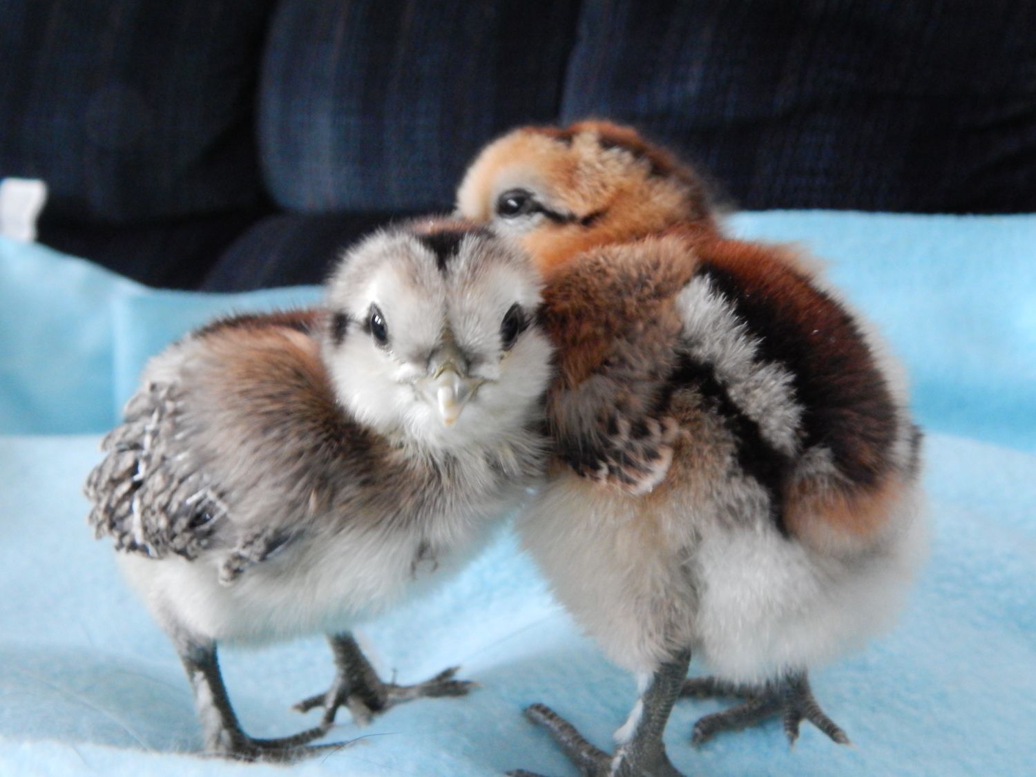 A few pics of our new babies. The Daddy's name was Yeti, so I named them in his honor. The Daddy was a white silkie, the moms are EEs. The black and white one is Sasquatch (Sassy for short), the bigger one is Bigfoot. Sassy has 4 toes on one foot, 5 on the other. Bigfoot has 5 on both feet. They both have black skin and feathered feet, but the typical EE chipmunk markings. I love them!