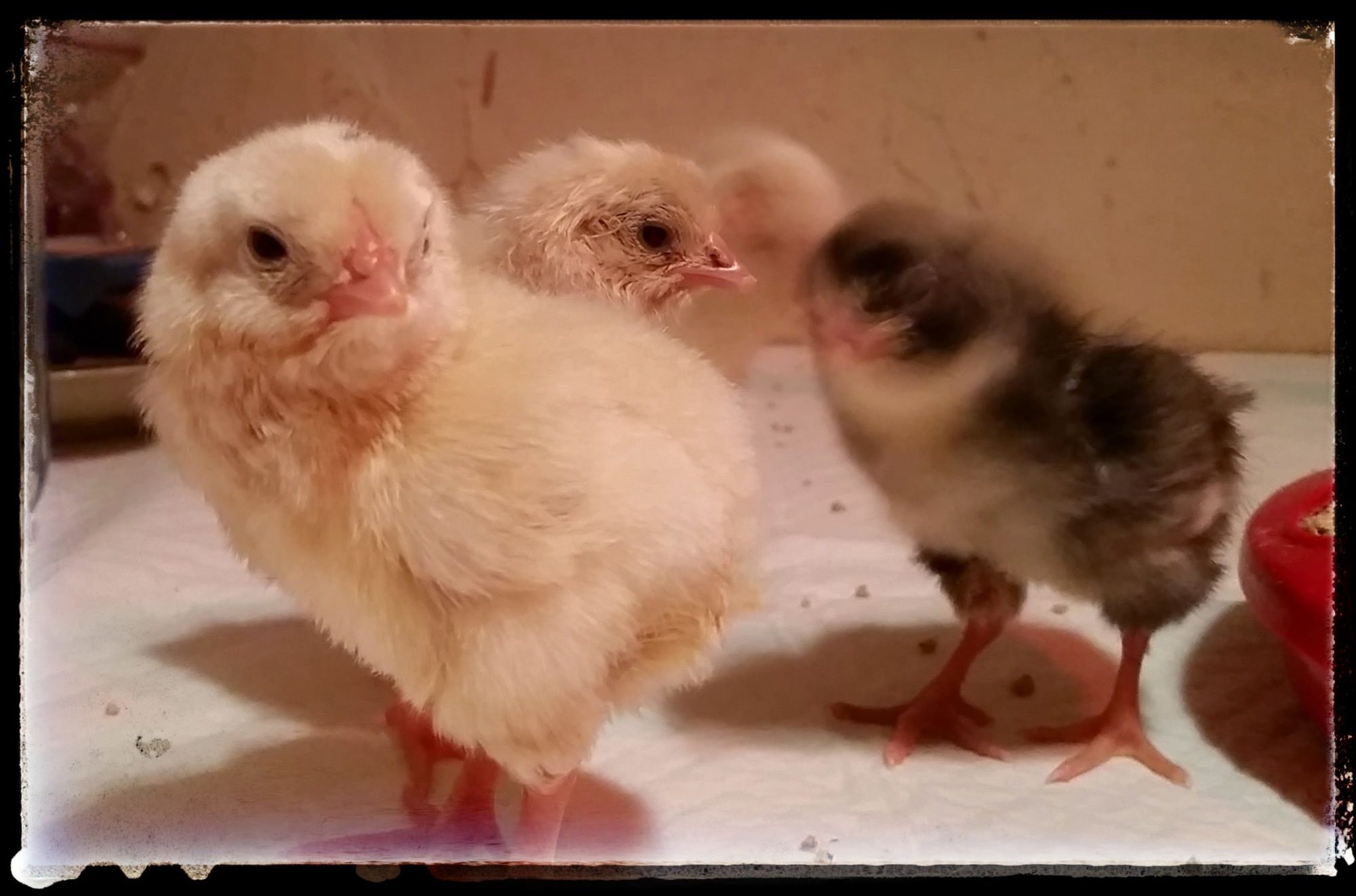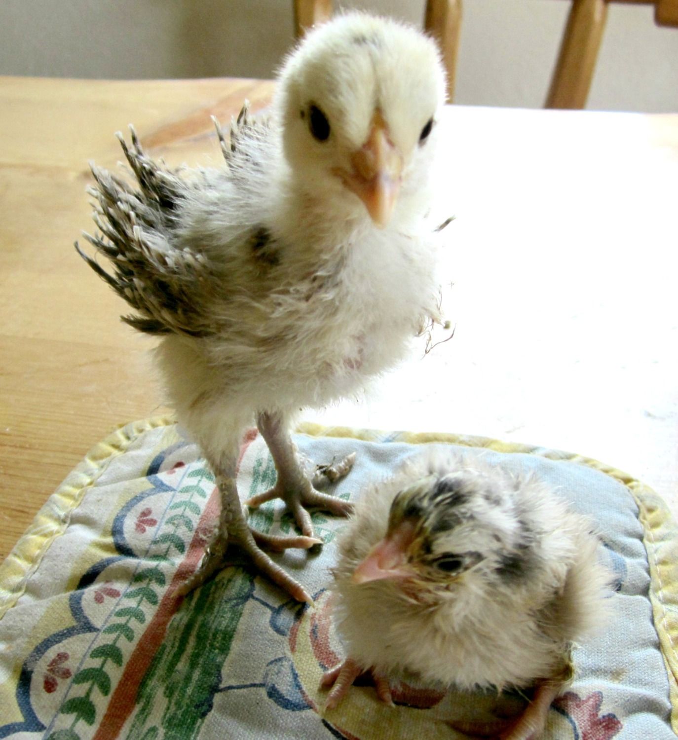 3 weeks diff in this group. 3 chickens is not very much, so they were happy to have extra. small hatches which I set anywhere from 2-8 eggs are nice for me. I like to have them in the house so I can visit them, before they stink. and they are spoiled with their chicken quilts.