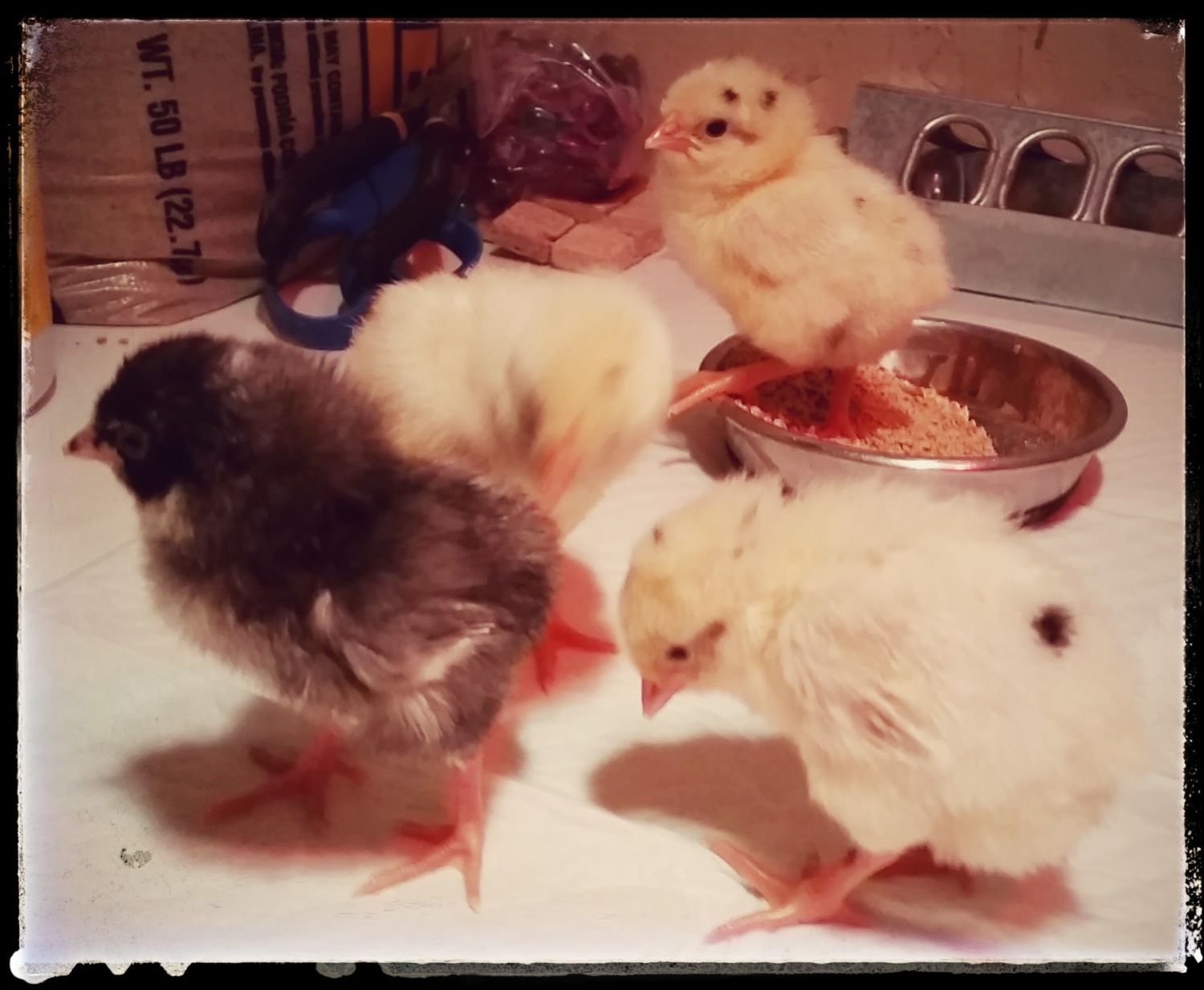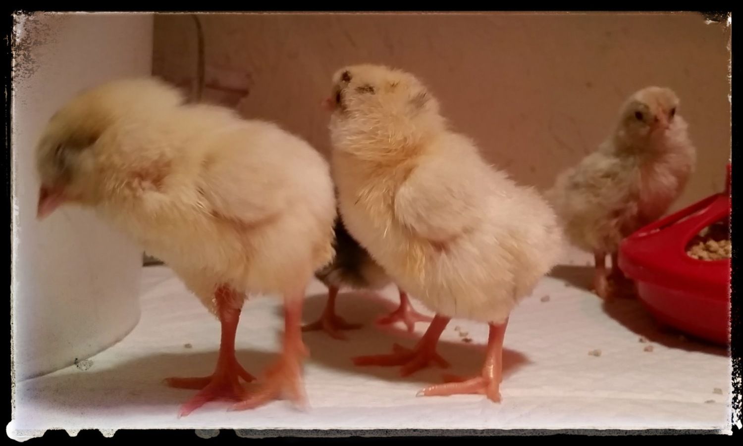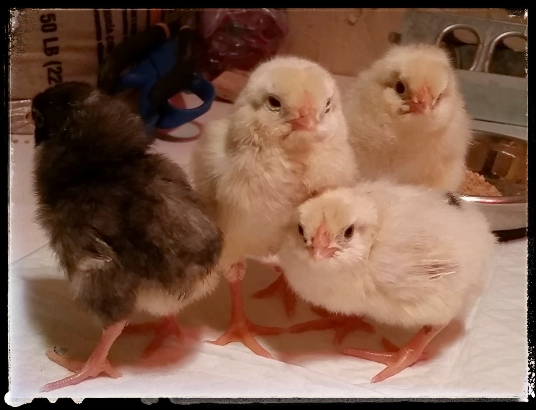 so cute. Thanks for sharing. I love the 4th pic, is that a frizzle? I'm glad to know you do fine mixing age groups. The lone chick I hatched in december is almost 4 weeks and a few days after she hatched we got her a buddy that is now 5 weeks old. My eggs in the incubator will be 6 weeks younger then the one I just hatched in december but I am hoping at some point I can mix them all together as well as mix them with my big girls who hatched Mar 2014. Will probably be quite some time before I get them all mixed together but I think my 4 big girls will be fine. To me they have always been super mellow and easy going. I honestly don't even know the pecking order in my group because they all seem to get along well.I have 3 eggys due in a week, 2 greens and a tan, early on I found out a bunch were clears or had a crack.Since 3 is not a lot to hope for a week out, I am now going to hatch these 4 fertile+1 dark tan (I don't think dark tan is fertile, but what the hey)