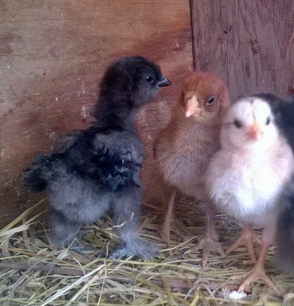 Both of my Silkie eggs were fathered by my Sizzle rooster or hens. One chick is a Sizzle (frizzled normal feathers) and the other is a frizzled Silkie (frizzle Silkie feathers). Only the Sizzle would stay still for a picture, along with a cute little red and strawberry blonde EEs.