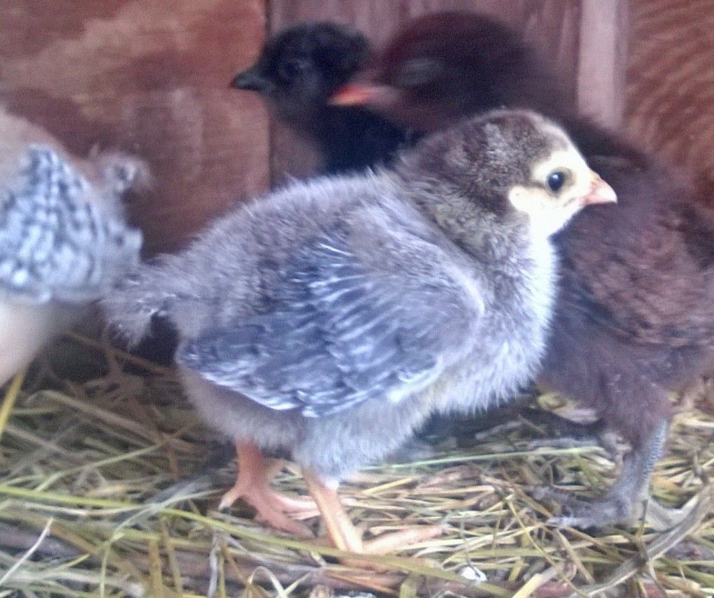 That little grey chick again, with the strawberry blonde, red chick in back and blurry and the chick to the far left are all of the EEs. The chick that looks black is actually a wonderful chocolate brown color, which you can sort of see in the photo above behind the grey chick.