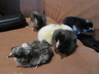 none of our ee's looked like those gray ones, interested to see how they feather our. The minky looking chocolate brown ones we have had look to have partridge feathering. Probably from our partridge Plymouth rock girls. Your silkies are soooooooo cuteFinally getting around to posting pictures of the chicks from my hatch. Sorry guys, I've been super busy (and I'm on vacation from work)! These were the best I could do, they weren't impressed with my camera. I ended up with 2 Silkie/Sizzles and 4 EEs (I had 5, one didn't make it). Both of my Silkie eggs were fathered by my Sizzle rooster or hens. One chick is a Sizzle (frizzled normal feathers) and the other is a frizzled Silkie (frizzle Silkie feathers). Only the Sizzle would stay still for a picture, along with a cute little red and strawberry blonde EEs.This little grey EE was very photogenic.