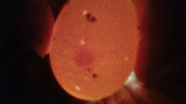 This is one of my Day 4 eggs. This egg came from my hatchery Jungle Fowl hen and is brown in color. It may be a bit hard to see because it is so early in the incubation process but the veins are there!