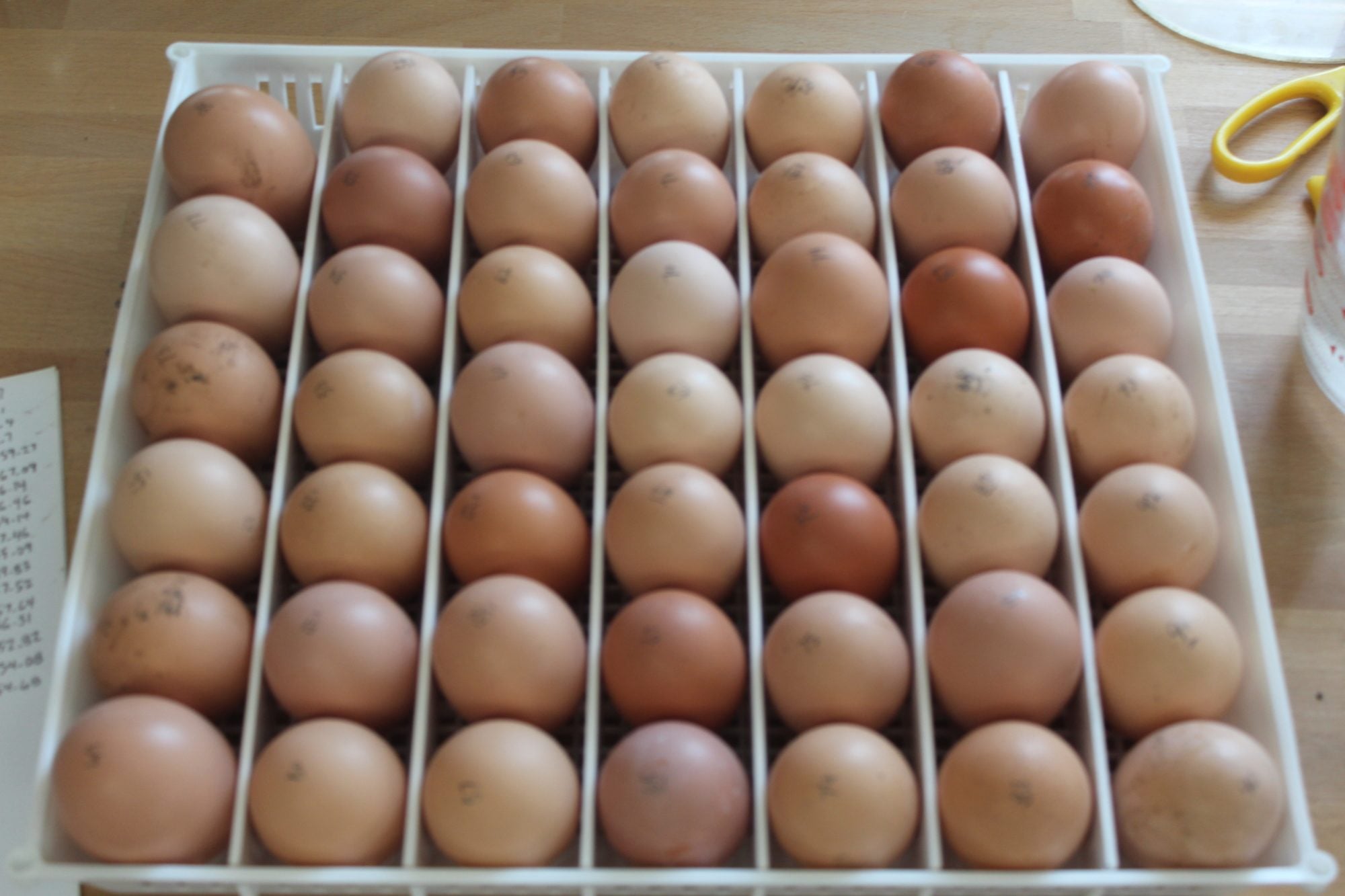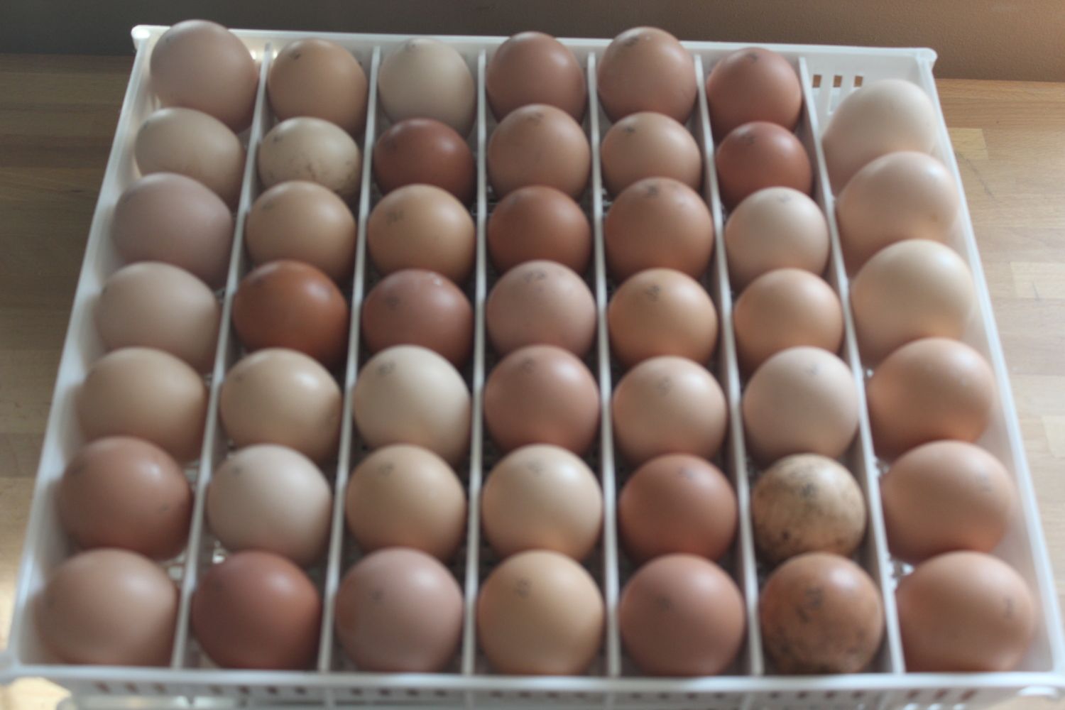 Well, 96 eggs set yesterday, only 14 older than 7 days with the oldest being 9 days. These are eggs from my generation 1 layers (I'm doing some inbreeding and started with BCM roos and Red Sexlink hens.)
