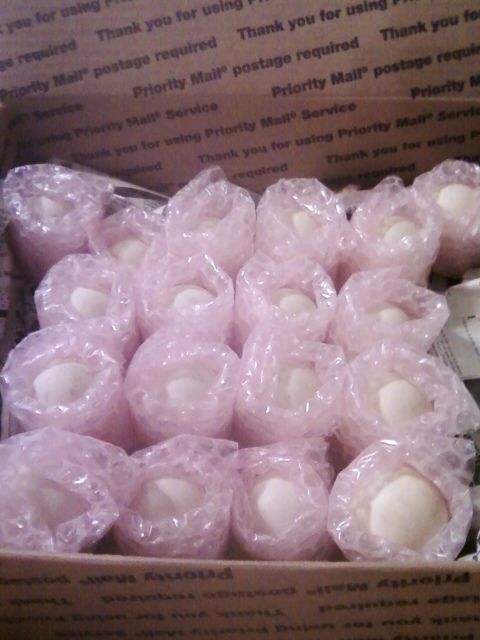 This is how I wrap mine.  I start with a smaller box, I crumple newspaper in the bottom.  Then I make a sleeve of bubble wrap around the eggs because the eggs are porous, they need to breathe.