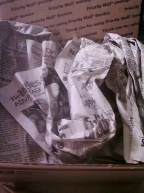 Then I get a larger box, crumple newspaper and put it in the bottom to create a cushion.  Slide the smaller box into the larger box.  Then stuff newspapers down between the sides of the boxes. to create a cushion.  Then more newspaper on top of the inner box and close the outer box.