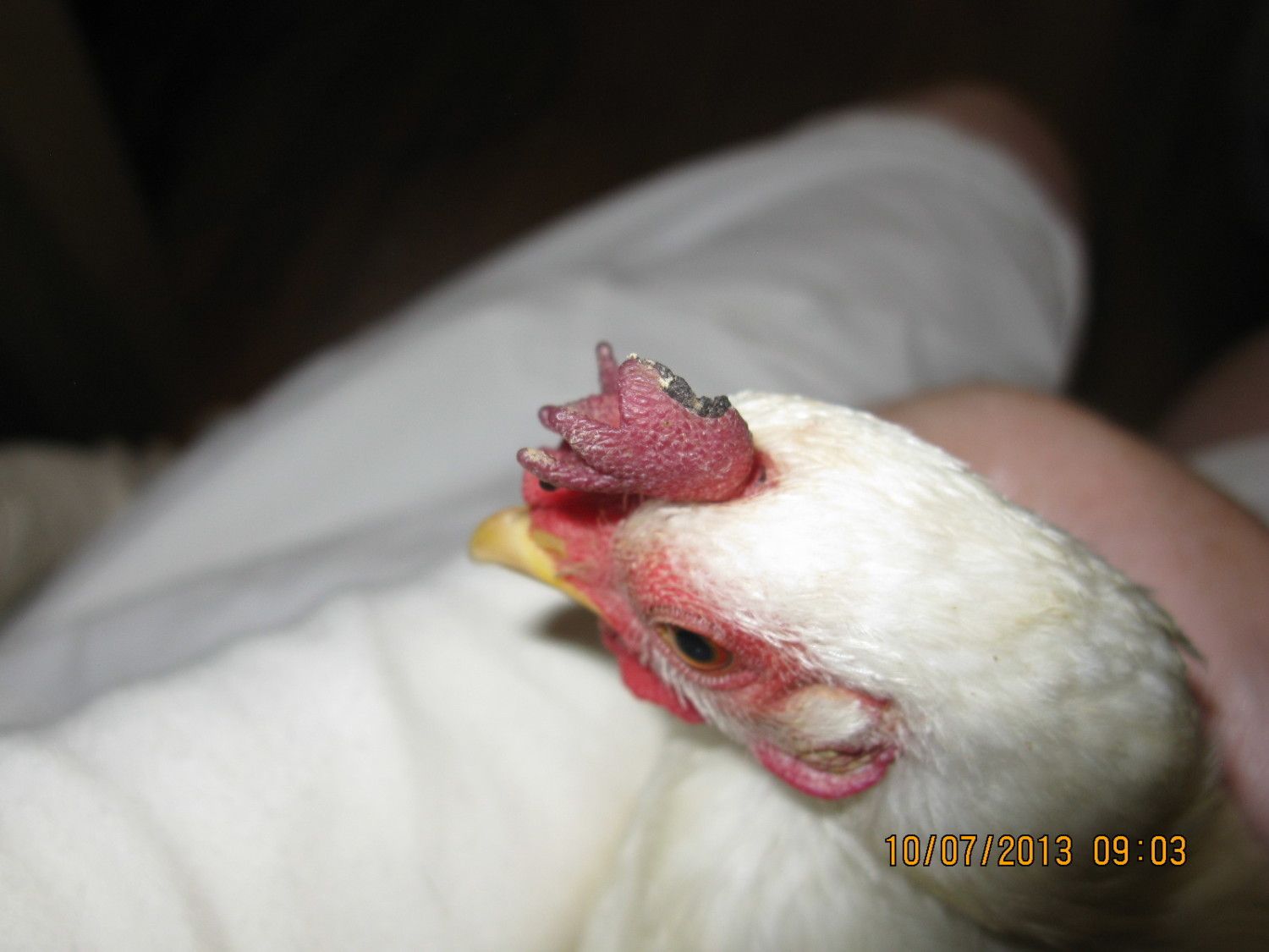 x2 Looks like a pecking injury to me if not frostbite (52 degrees isn't cold enough).It honestly looks like a scab to me. Chickens have tiffs, she may have gotten nipped by another...