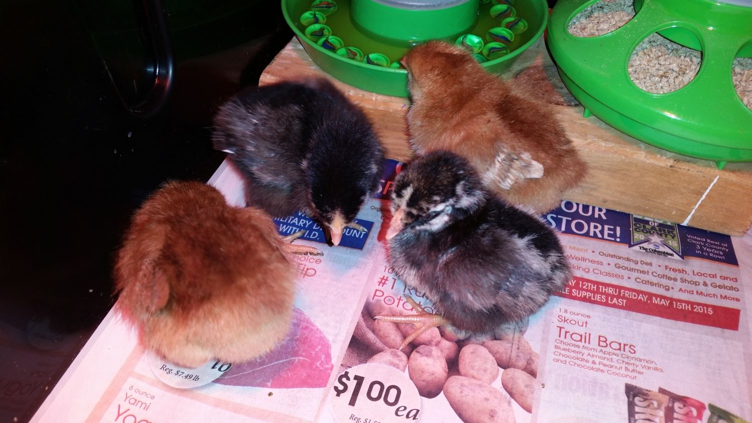 Just received 2 Rhode Island red chicks (RIR) and 2 Silver-Laced Wyandotte chicks. They are eating, drinking, sleeping, and playing well together.