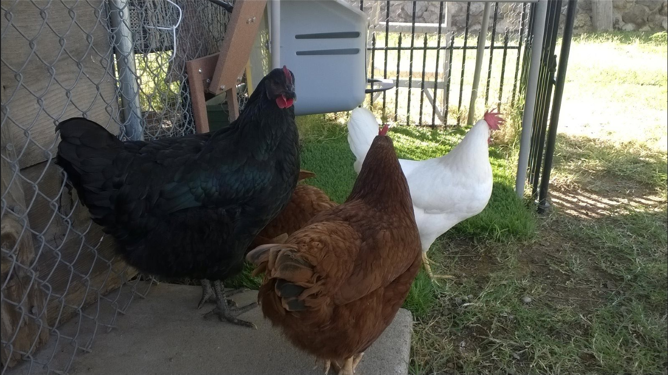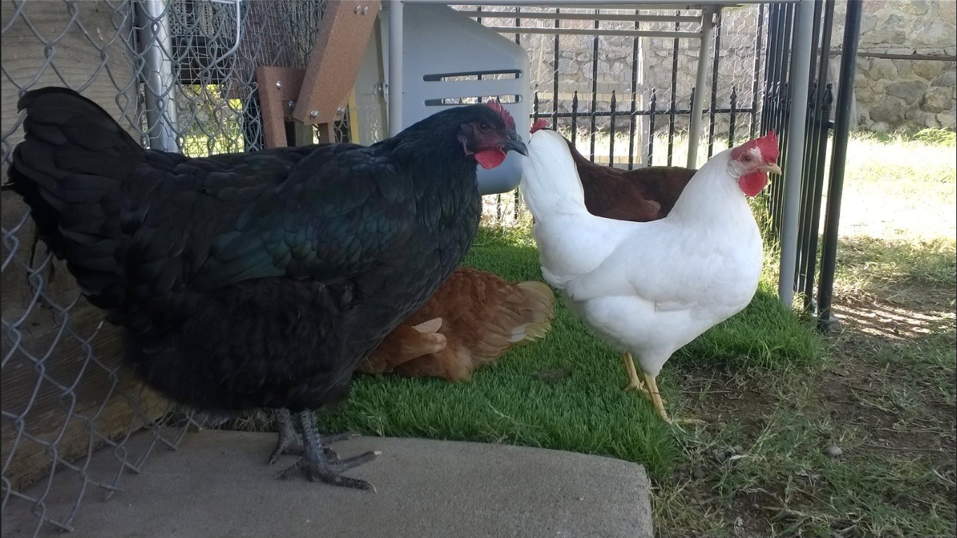 This is the contrast between Onyx, my oldest hen Orchid (the white Leghorn), and my third oldest Rose (the Rhode Island Red). Onyx towers over the other girls and Orchid head just barely clears the height of Onyx's shoulder.
