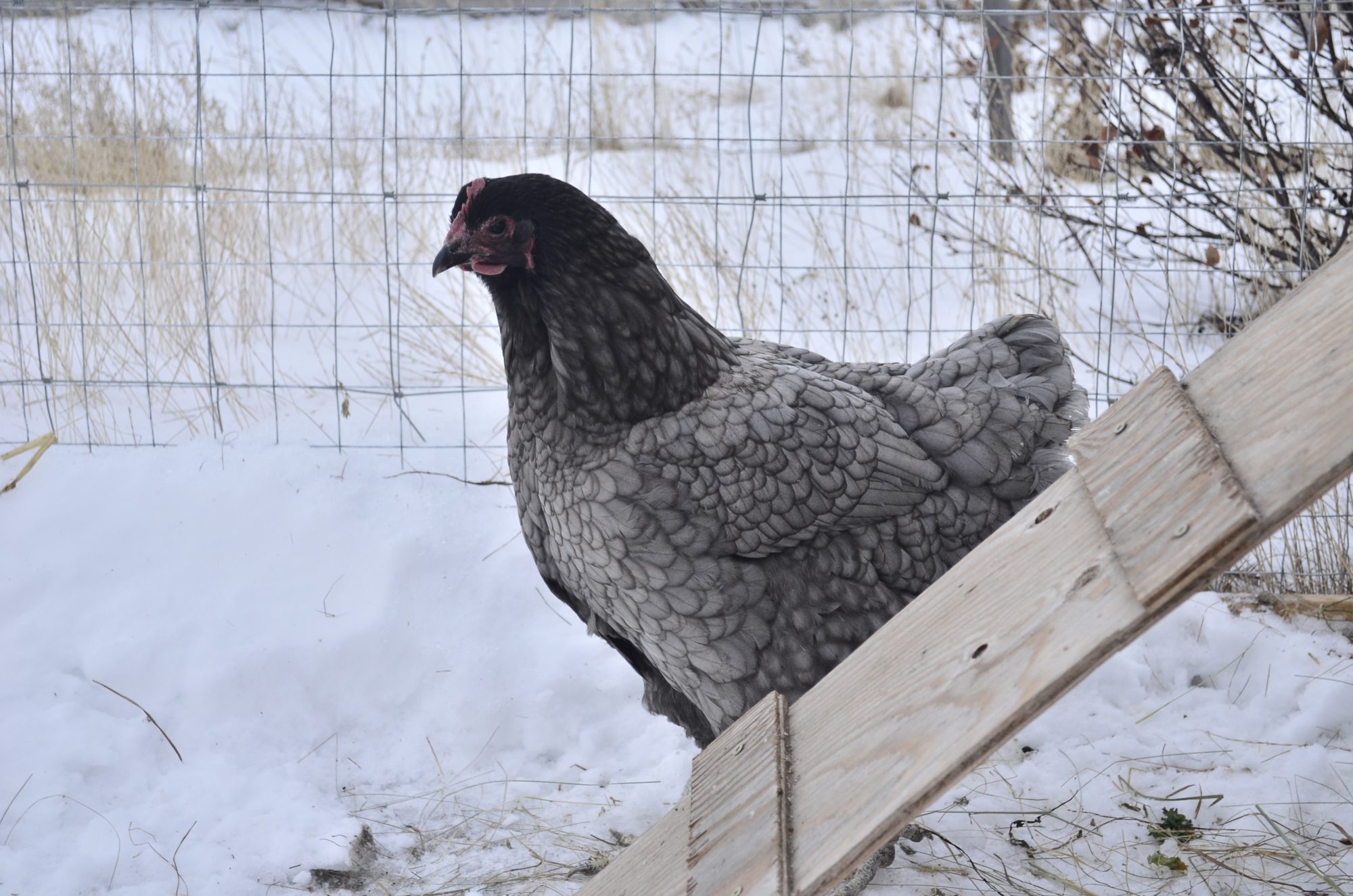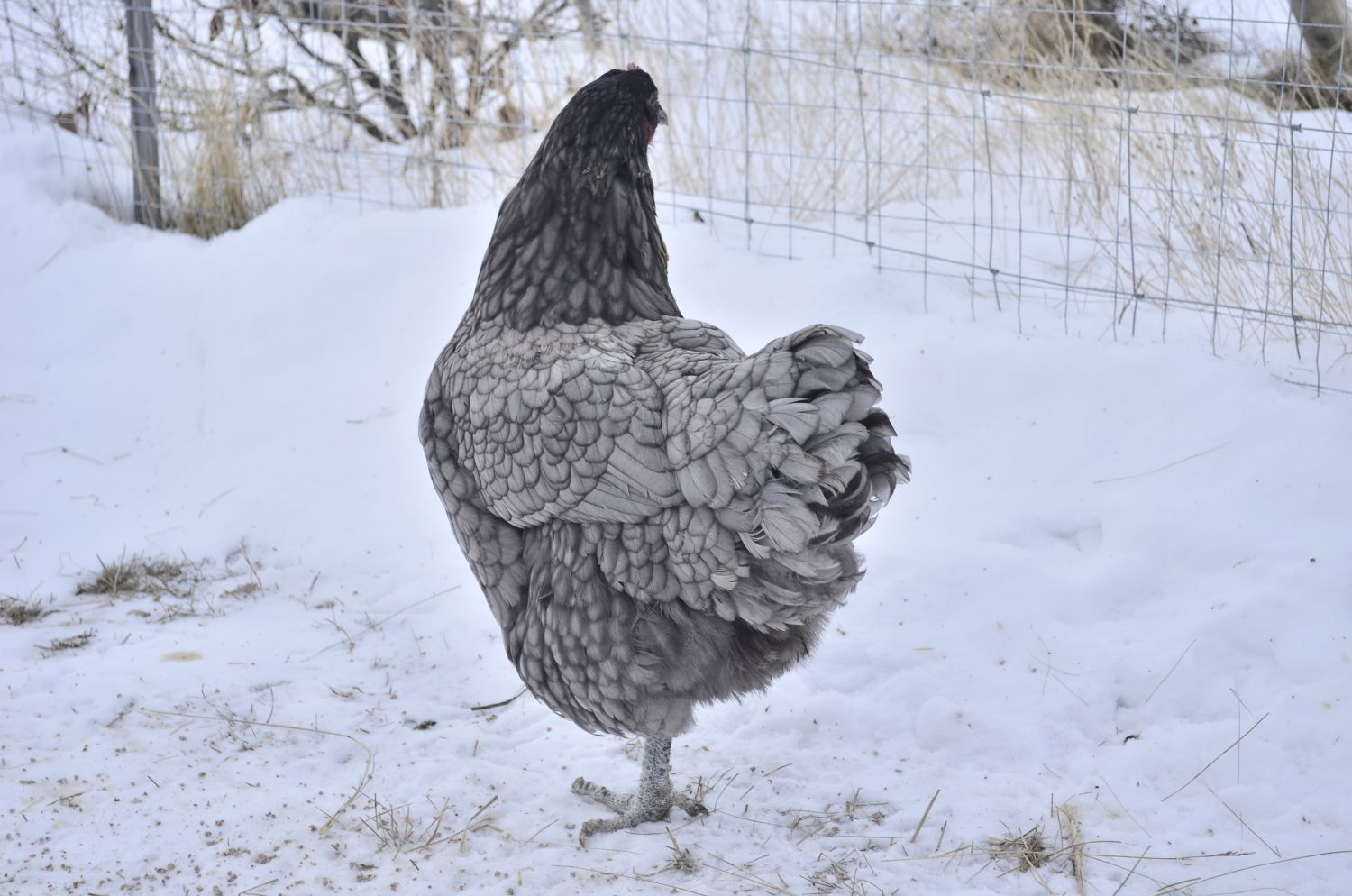 Can you get more pictures? Like from the side? Her back looks a little short but part of that could be the picture?? Her tail looks narrow/pinched. I really like her color and she has nice lacing. Also an appealing head w/o being to small, nice eye color from what I can see. If you do decide to get a rooster, try to find a nice wide black one.