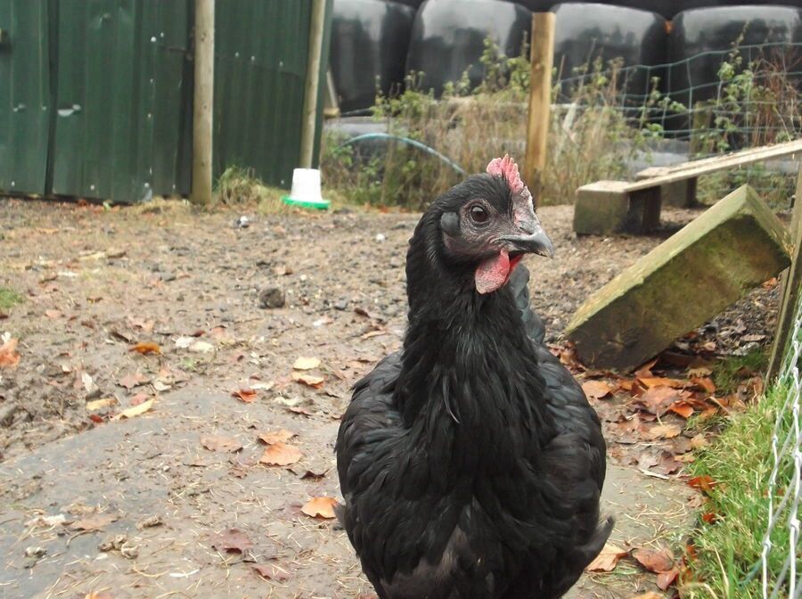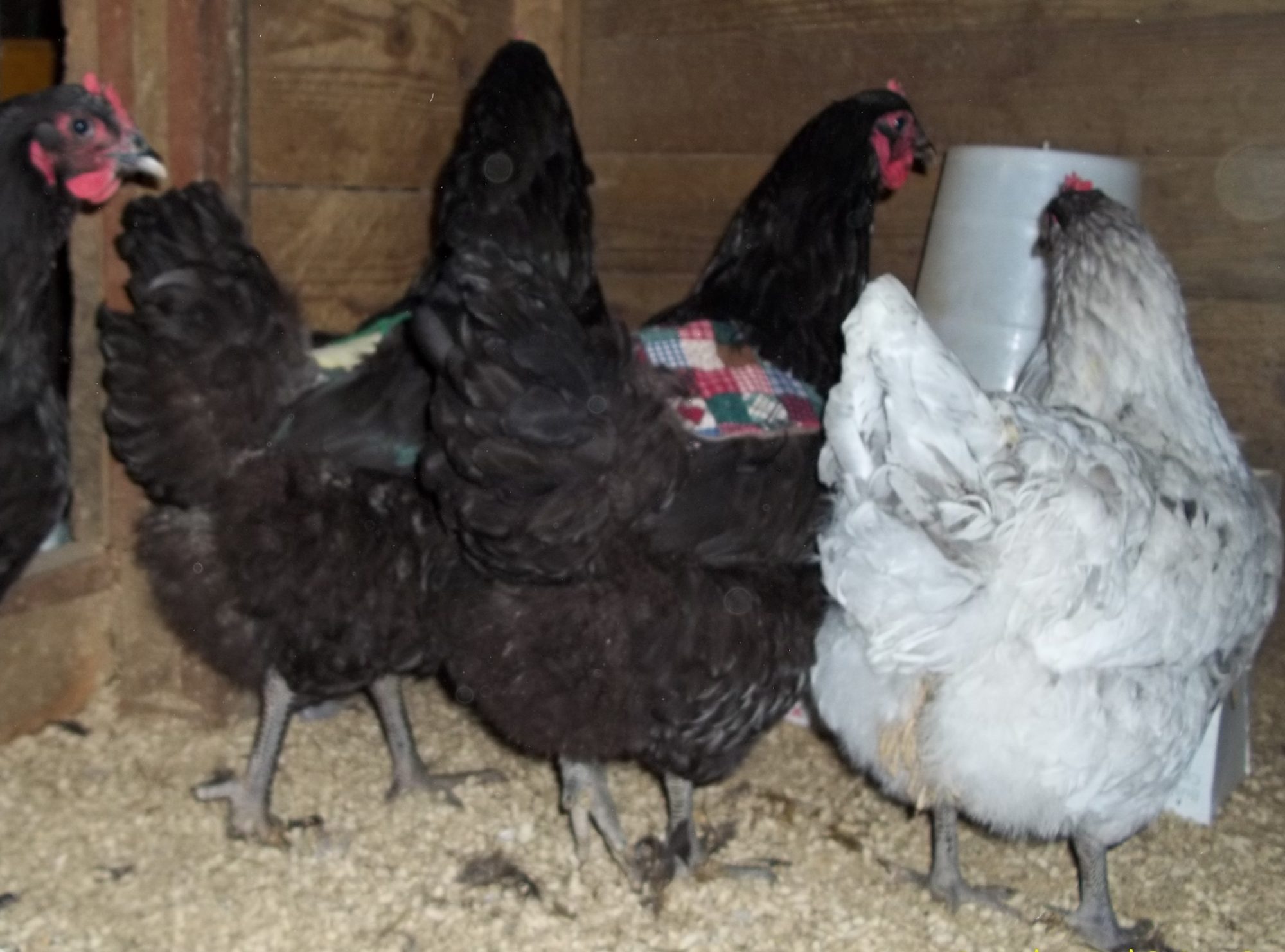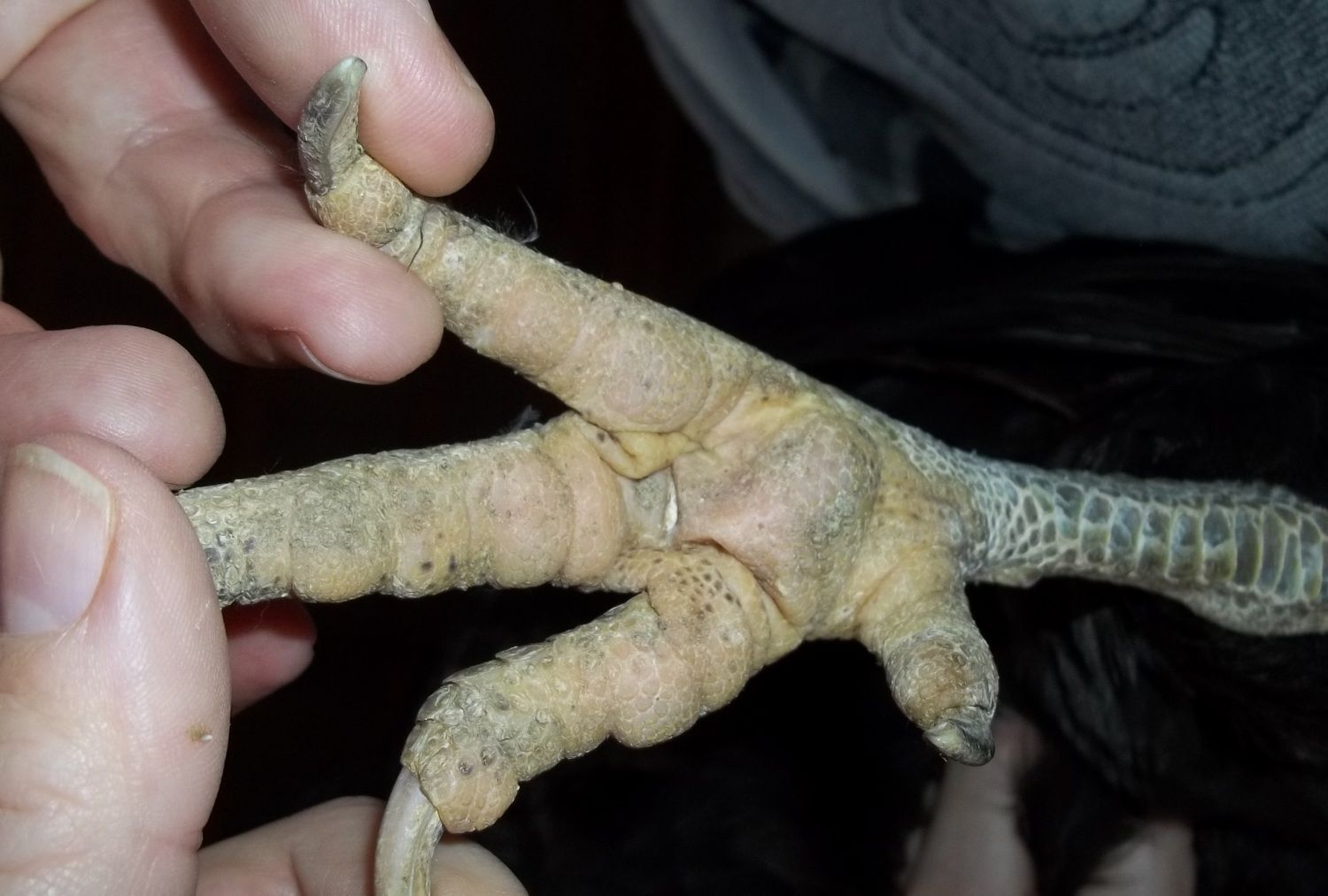 Someone may have addressed this already, but Jersey Giants DO NOT HAVE YELLOW LEGS. The bottoms of their feet should be yellow and, in fact, if there is an absence of yellow (i.e. if the bottoms of feet are slate, pink, or white) they would be DQ'd, but the shanks should be slate. Here is a close-up of the correct coloring for the bottom of the feet; this is a hen that was in full lay - often when they are in full lay, the yellow gets a bit more dusky, but you can definitely see they are yellow and not white or pink: Here is a pic of a few cull pullets/hens - note the leg color is slate, not yellow: Also, the eyes should be very dark - almost black.