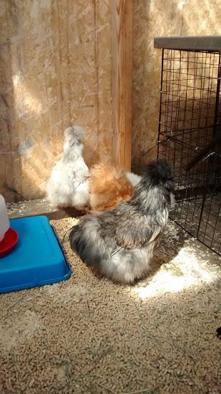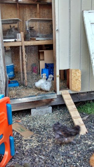 Today was the chicken's first day out, after a week and a day. After the sun set I wanted them to go back in the coop and that was a pain! I even brought a yummy treat in there, but because they haven't figured out how to use the ramp yet, I had to pick a few of them up and put them in there, and the silkie hens hated that! My RIR, Sadie, was just fine though. She likes to be pet.
