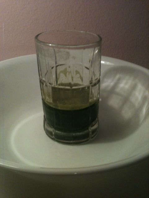 This is part of a photo display I did on juicing. That is a 40 oz. bowl of salad greens that came out at 2.1 oz. of juice. Of course I add apples, carrots, beets, fennel etc. when juicing since straight greens is still unpalatable to me. Good to show the nutritional density of juicing. I mean, how many of us would eat three 40 oz. salads a day? Not me. But, a 6 oz. glass of juice, easy, peasy.