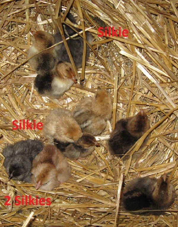 Four are silkies (from what I can tell, they are two black and two buffs, albeit one is lighter than the other) and the other six chicks are ?. I was originally told they were Birchen OEG, then no, they were Mille Fleur...but now that they have hatched out, I don't think they are either. However every single one of them have feathered feet, and the eggs they came from were almost round (rather than oval) and creamy white, and much smaller than the silkie eggs. Anyone want to venture a guess, other than just some sort of bantam?