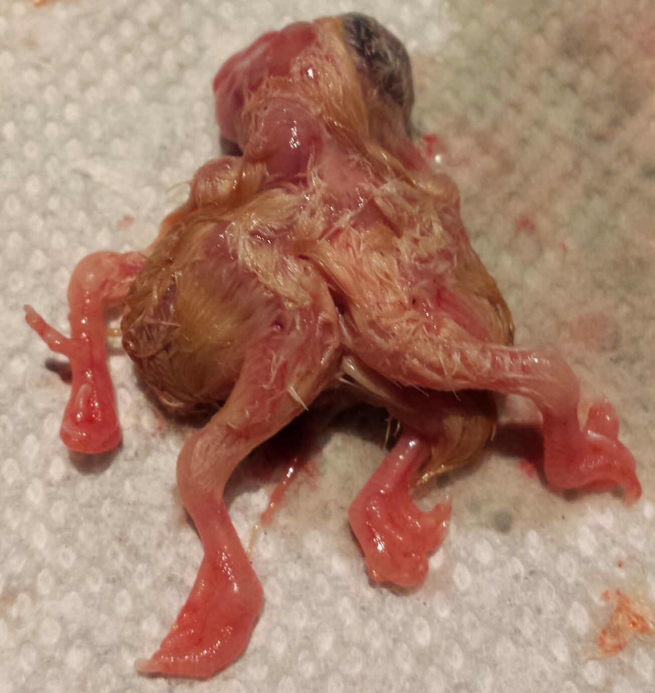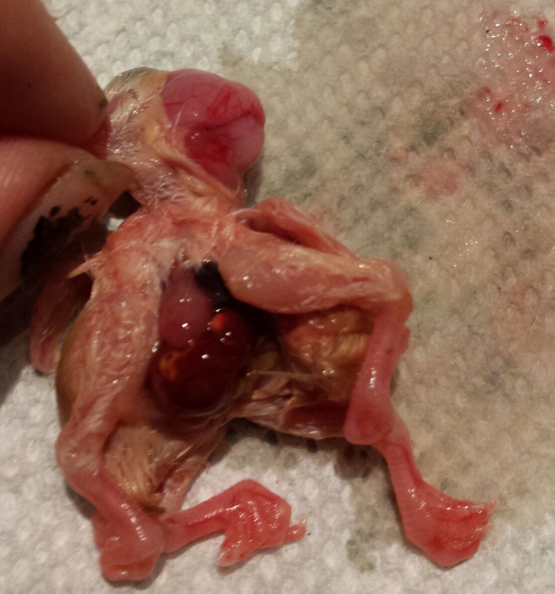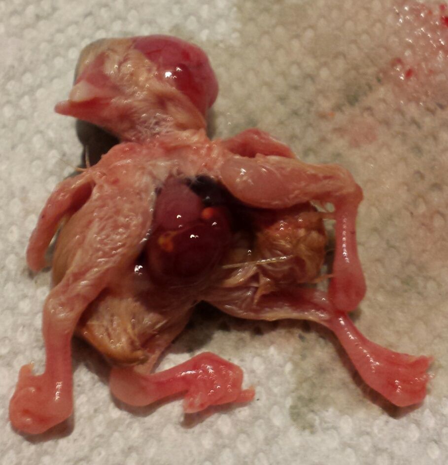 Omg omg omg... WARNING GRAPHIC SCARY PICTURES I just candled to get ready for lock down and had like 6 late quitters. Really late quitters. So I got curious and cracked them open... Most of them were like day 15 quitters..but then I opened the strangest thing I have ever seen so strange I'm not sure I should share it but I have to...I'm now wondering if my chickens took a trip to chernobyl when I wasn't paying attention, because one of the late quitters was a salmon faverolle that was cross beaked, had its organs on the outside of its body, had only one eye and what looked like brain protruding out the other side..and the kicker...it had 4 legs. 4 whole legs. 2 wings, 2 butts... so 1 eye, organs on the outside, crossed beak, and 4 legs.. What in the great beyond could cause that?! I'm now afraid of what monsters might hatch out of the remaining eggs... I've only had like 1 day 10 quitter before...but to get six since the last time I candled...and then to find out one was an absolute mutant now has me very worried. Anyway here are the pictures. I'm also going to start a thread to discuss exactly what happened here... There it is. Since these are sex links I can tell it would have been a boy... Severely crossed beak and what appears to be exposed brain... A better shot of what might be brain, but definitely isn't an eye... Just another shot of this horror fun house chick. It's cool in a terrifying way. Here it is from the back..I would think it was a case of twins gone wrong except this was not a double yolked egg unless both yolks were tiny, and this monstrosity was attached to only one yolk sak... I also want to point out the hen that laid this egg has been acting weird. This was one of the last eggs she laid before stopping, and now she seems to have an egg stuck. Based on this though I'm ready to cull her. She's obviously been eating plutonium. Close up of exposed organs.. I'm tempted to freeze this and I don't know..send it somewhere or something. All the other early quitters were normal chick's that just stopped developing. Anyway if anyone knows what might cause so ma you severe and strange abnormalities please let me know. I've hatched 40 some of these same chicks and not gotten a crossed beak or curled toe on a single one..and this abort had every possible thing wrong with it I think it could other than having a couple of fish fins on it.