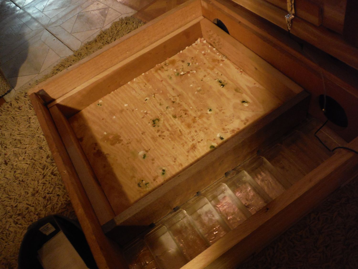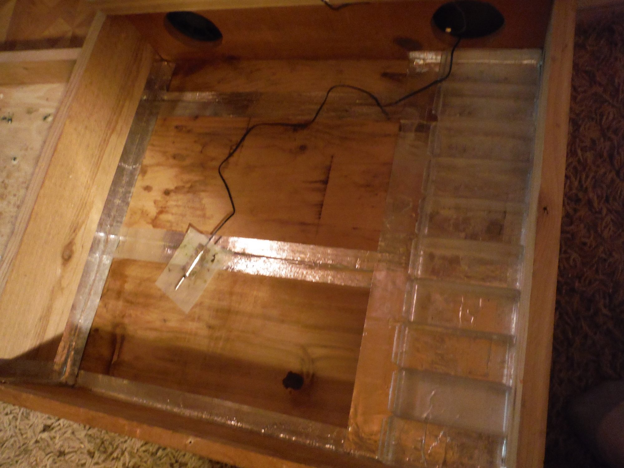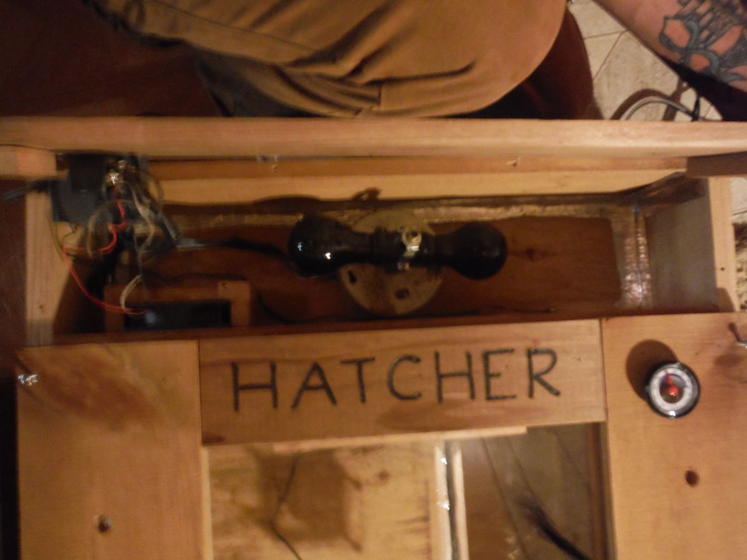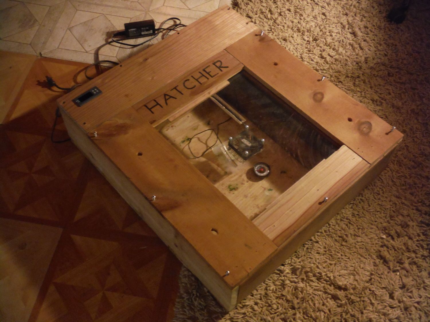 First I built a wooden box, I made a divider wall with a hole cut on each end of it and glued/ brad nailed it in place. I secured a computer fan on one end and placed a dual light fixture in between the holes in the back compartment. Later I wired up a relay and a temperature controller so that I could get a steady even temp. I built two lids for it. One for the rear compartment and one for the front compartment. The front compartment has a plexiglass viewing window a small computer fan mounted to the plexiglass to help with circulation. I built a second box (a tray) and set it into the larger box and in front of the exhaust side or heated side of the box I put several small plastic tray so I could accurately modify the humidity. It requires 2 plugins to operate but does a great job. I call it the HATCHER. I usually only use it when the chicks go into lockdown. until then they stay in my larger incubator w/ a built in turner.