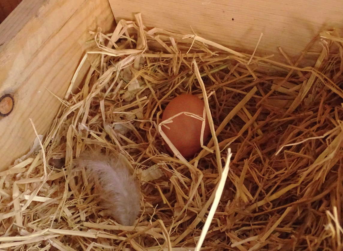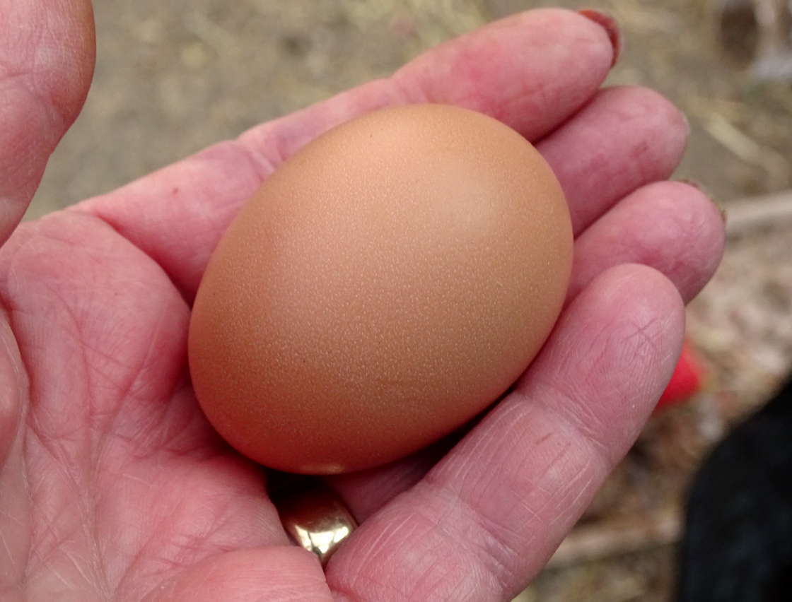 Not too bad for her first one! I think she's going to be a good layer. I've heard of hens just dropping eggs unexpectedly wherever the first time and being all freaked out about it. So for her to be so prepared and to go sit there in the nesting box for a couple of hours...that's pretty cool, I think!