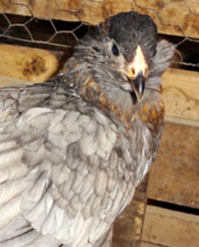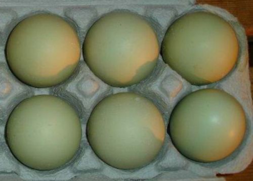 They have pea combs, full tails, muffs, beards, and mostly slate legs. They are excellent layers of greenish L to XL sized eggs. As with all colored egg layers, the egg colors do vary a bit, according to where the hen is in her cycle. The photo below is a good representation of what you will get. There are also pics of some of our breeders. If you put the chicks from these eggs back with a dark brown egg layer breed, the eggs will be much darker green in that generation.
