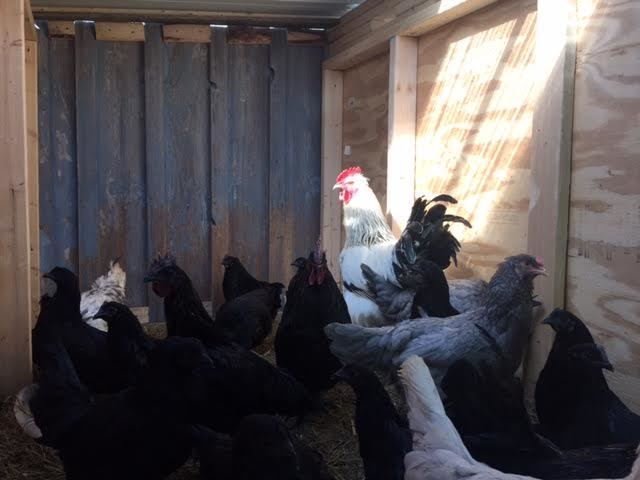 This cross is a Hona rooster dad and black isbar hen product. He's coming at me sideways in this pic as he is the protector of this crew.