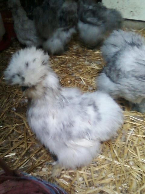 The hens are blue, black, paint, partridge and silver laced grey. All the hens are frizzled except for the sillver laced grey, she carries the frizzle gene. The roo is a paint silkie but he has very few black spots and they are small and the same with the paint hen.
