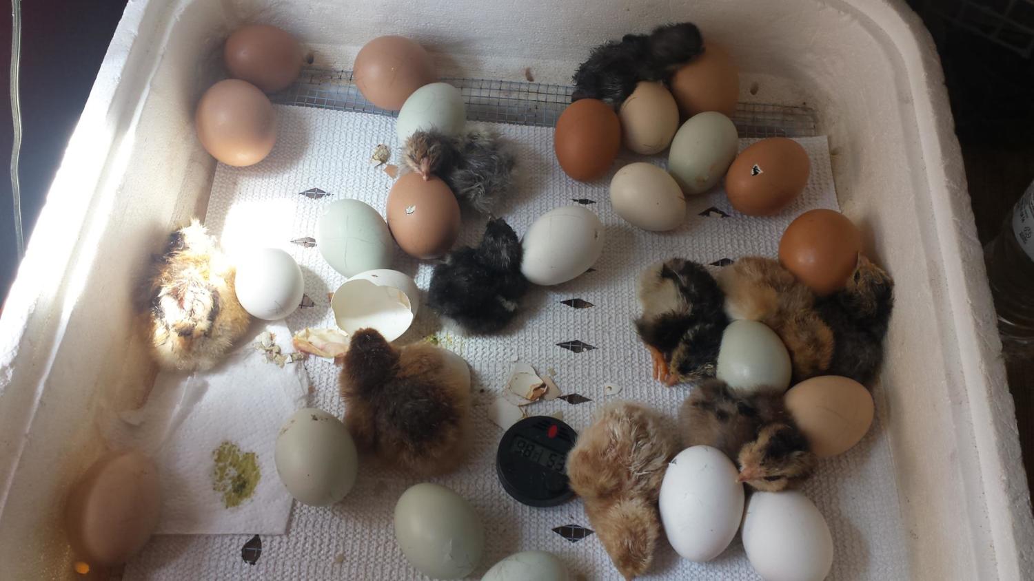 I'm just excited that I actually have chicks. I bought my incubator used off craigslist, my cheapo thermometer with built in humidity reader was off for the first week, on day 15 the temp in the bator shot up to 102 degrees (thankfully I was obsessed with checking the bator several times a day), and then after frantically cooling it down, I couldn't get it pass 97 degrees for a few days. The last 7 days, all I could do was cross my fingers and wait. I woke up today to this: