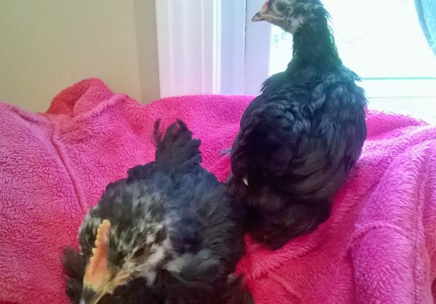 5 weeks old, kind, playful, and friendly to everyone but my tiniest Sebright. I can hold on to them for a little bit, but city ordinance says no roosters. Already showing touches of green on the black feathers. Will cuddle for mealworms and scrambled egg treats.