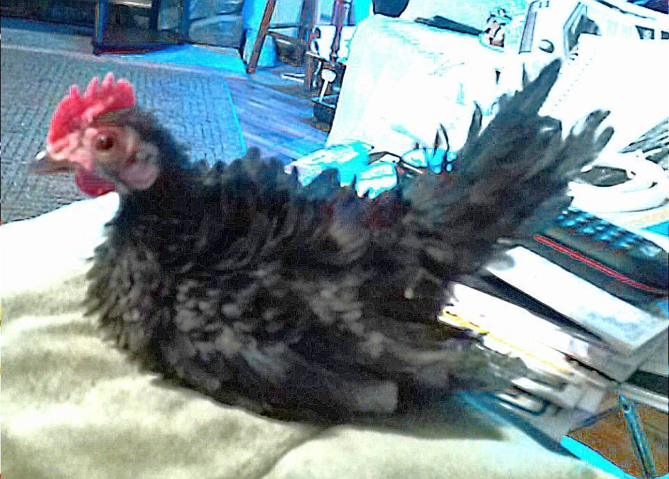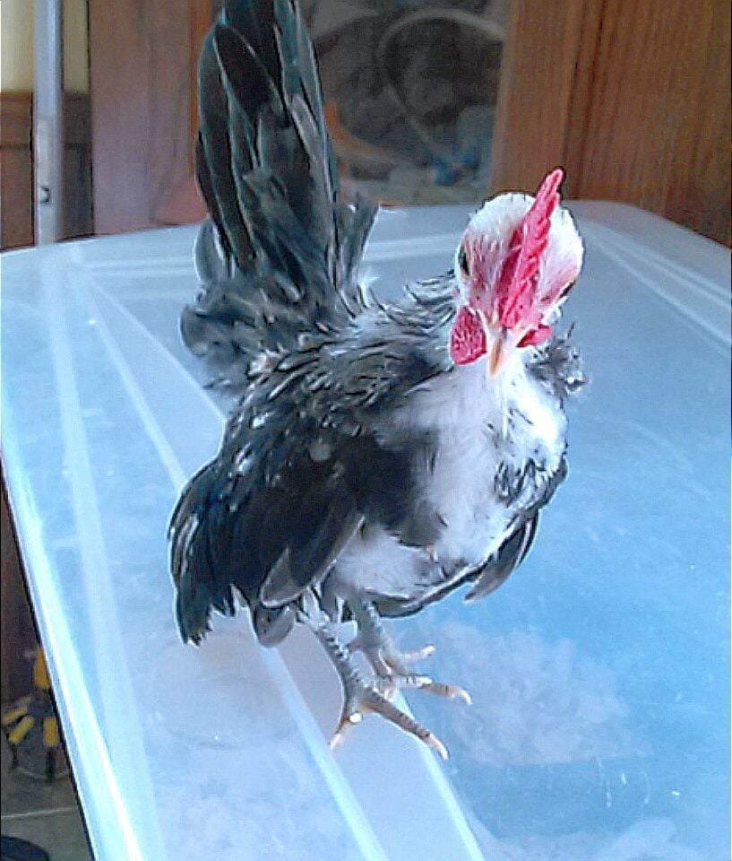 Cole at 11 weeks-6.5 ounces. Kate he's one of yours, but I'm about ready to give up on taking pictures. Between birds not cooperating and this computer just ruining what the camera has captured... Normally he is quite upright-stance, tail, and wings. Nice trusting bird. Easy to handle as is his white brother. My wife took the picture and was going to get one of the white roo, but we decided we'd had enough frustration with pictures for one day. I'm very happy with all five; well, four anyway. The one roo w/smooth feathers is being sold. Nice bird, but another rooster I do not need. I'm still hoping to get some silkied eggs from you to get an unrelated silkied rooster from. I do have one I hatched from my own eggs-actually the tribble's eggs and my frizzle rooster. Still I think totally unrelated might be better..