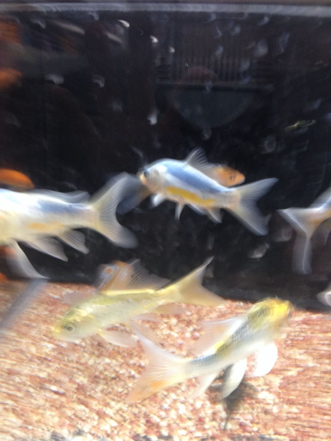 I don't know how well you can see this koi. He has a blue stripe and a yellow stripe on his side. I have never seen a koi this color. There were four of them at our local Wal~Mart.