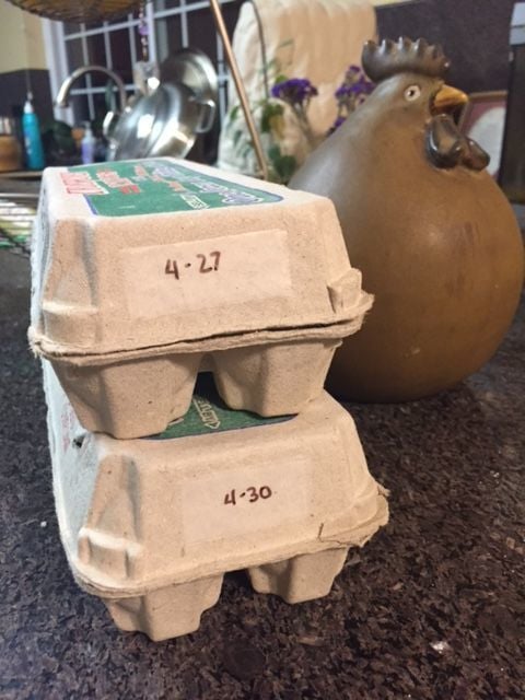 I struggled for years to keep track of which eggs were the oldest and use them first, and finally having hit on a simple solution, I wanted to share it. I put a piece of Scotch tape on the end of an egg carton to create a "plastic-y" area, then write the date on it with a wet erase marker. When the eggs are gone, I can wipe off the date and reuse the carton with a new date.