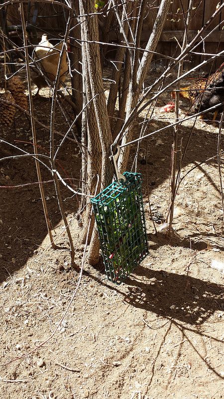 I give mine various leafy greens as part of their diet, and to keep them stimulated I cut/shred everything up small and toss it all over the run. That way they have to scratch around and find the goodies, it's not just sitting in one place. Food toys are fun for them too!