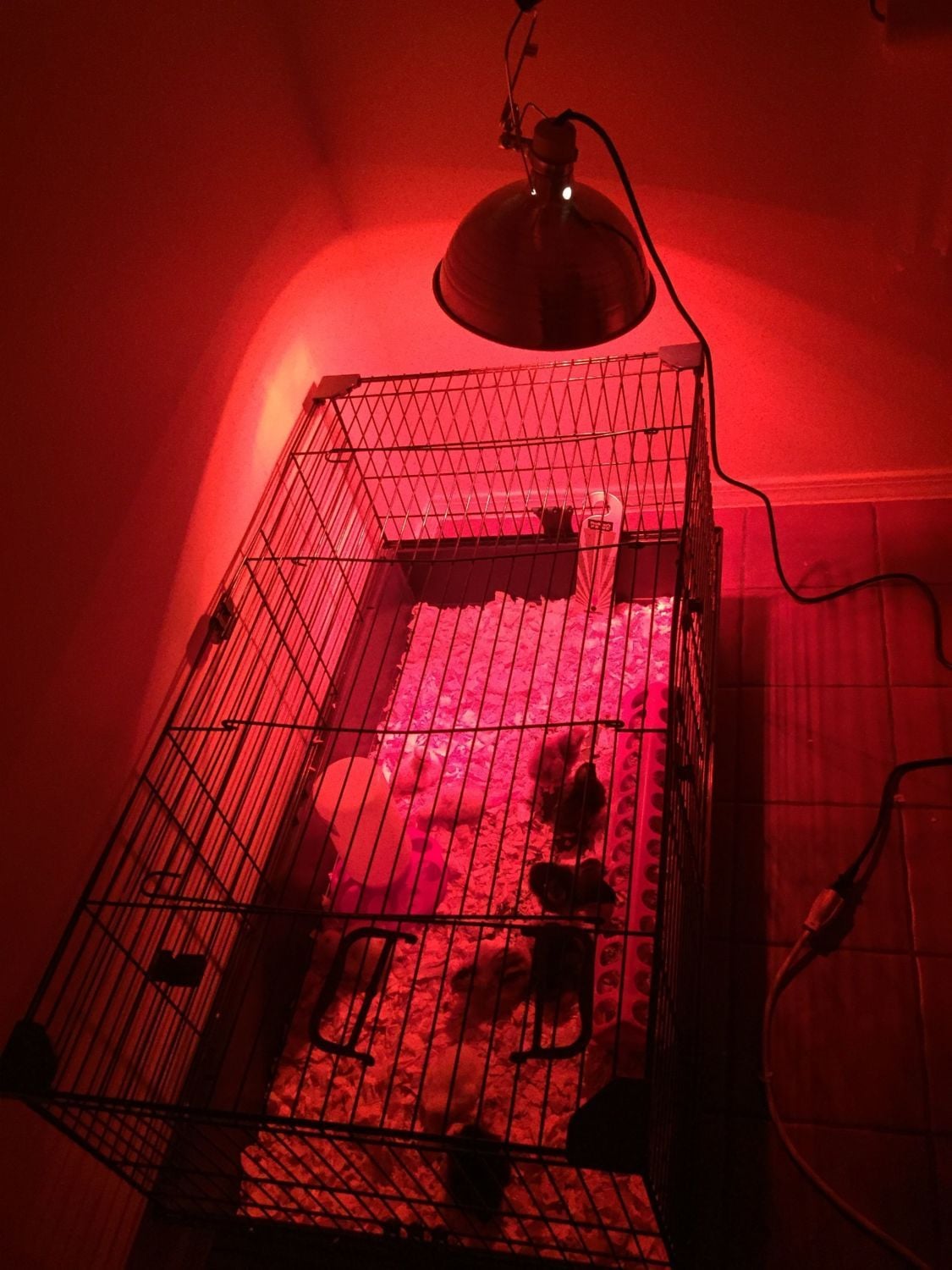 I have the chicks in a large Guinea pig cage in a small bathroom with a window. Window is open at night when we don't have the ac on. Temp says 95 under the light.