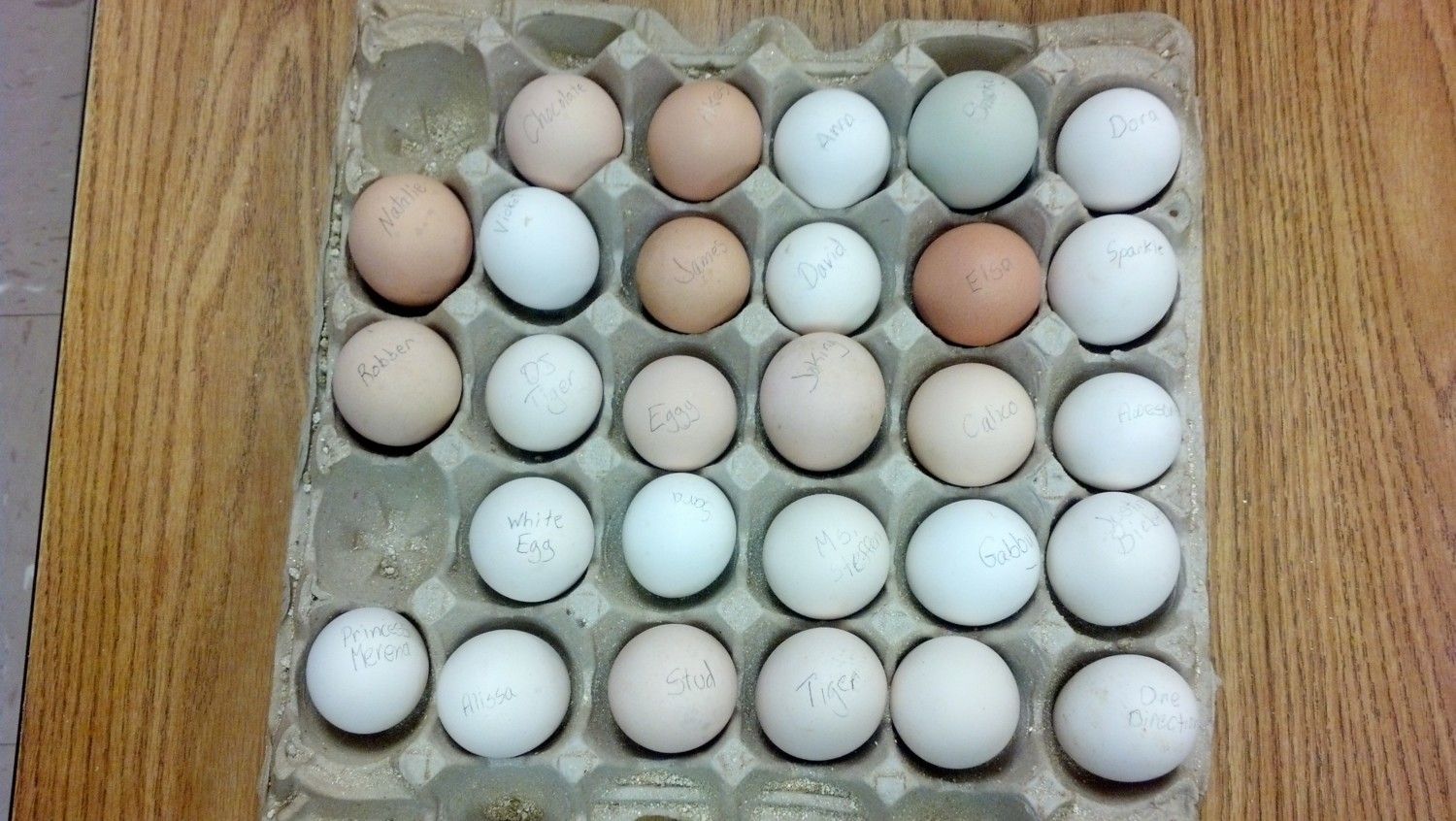 The kids each named an egg. It's always really interesting to see the names they come up with. This year we have a "Stud" "One Direction" and "Chocolate" among others. Some of the staff also named eggs.