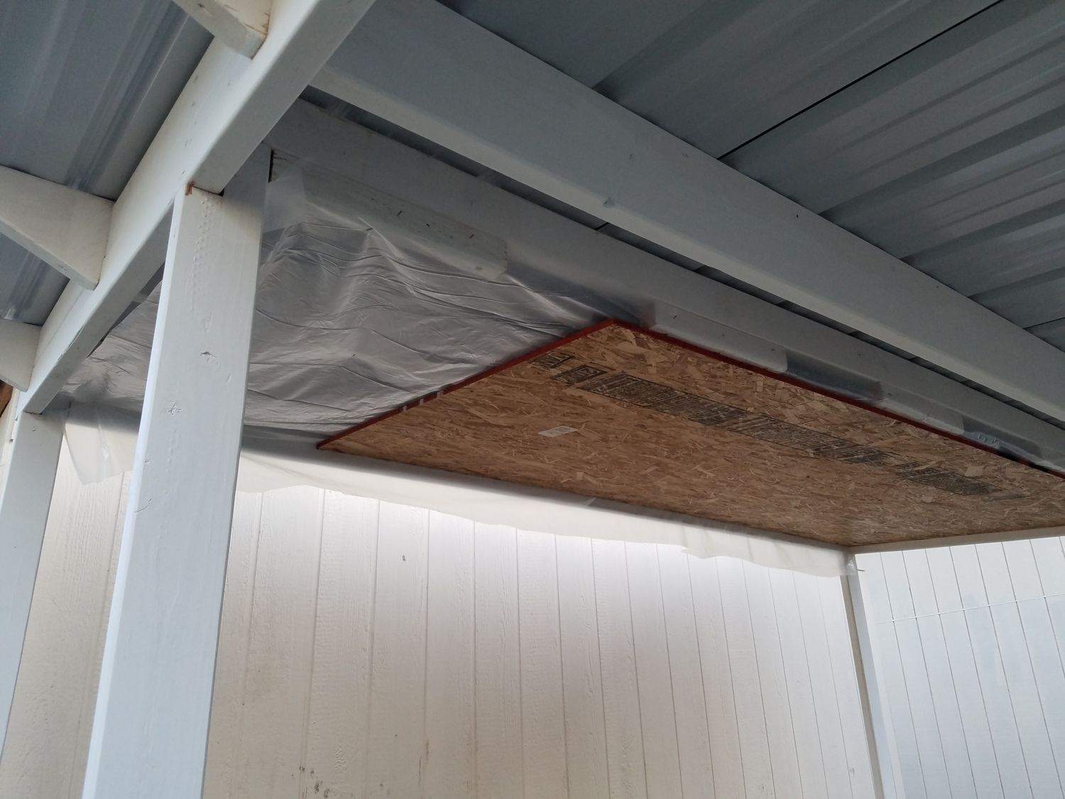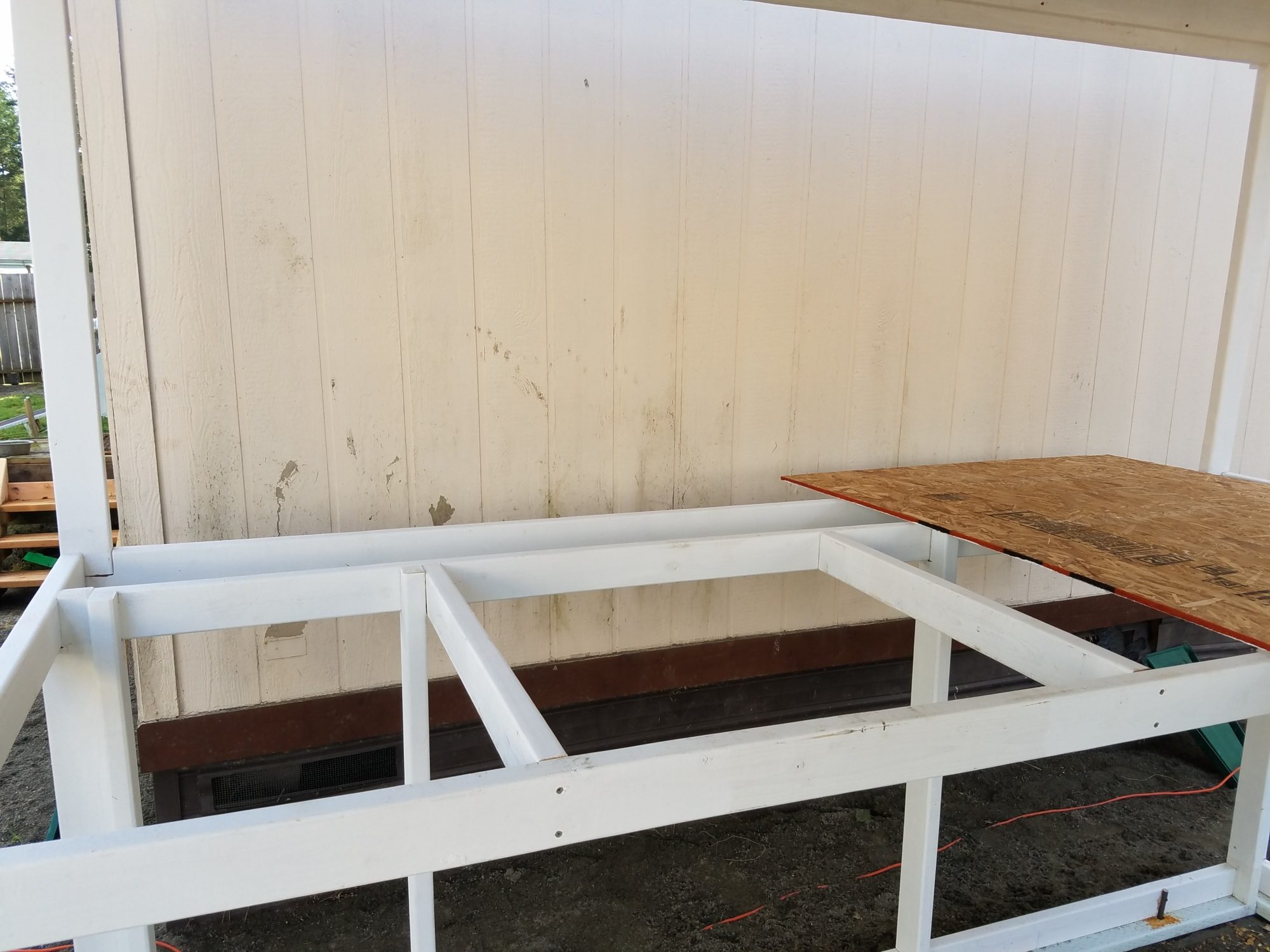 Still planning on the plywood top, will nail to the bottom of the rafters. Will also need to drill some large holes in the spacer blocks between the rafters over the coop so I don't have a trapped airspace. I have a 2 inch forstner bit that will do the job nicely. The holes will get covered with screen material to keep out hornets and birds.