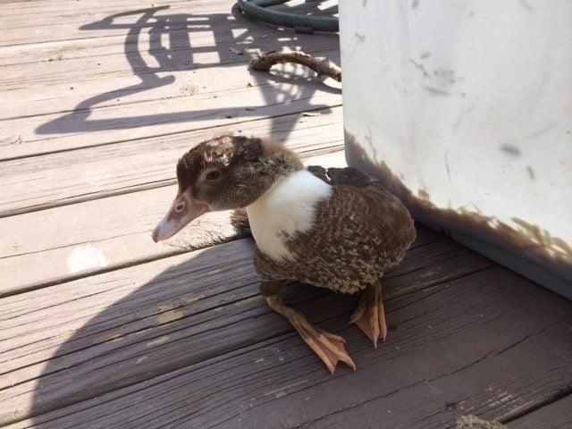 One of our 2 month old Muscovys suddenly about a week ago could not walk. It is up about as far as its legs can support it in the photo. It hobbles around and uses its wings to crawl. It had been fine before, tough it did seem to be the runt of the group of six we got. No apparent signs of trauma, no exposure to predators and was not exposed to any high areas it could have fallen from. It does not seem to be getting better. We asked the family from which we got it if this had ever happened to others and they said not.