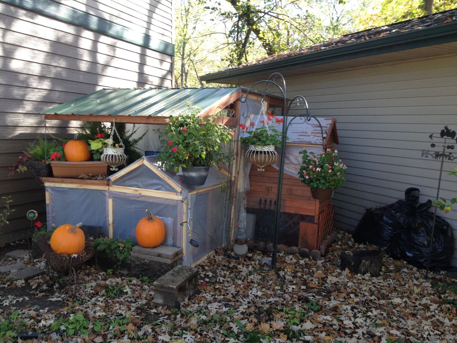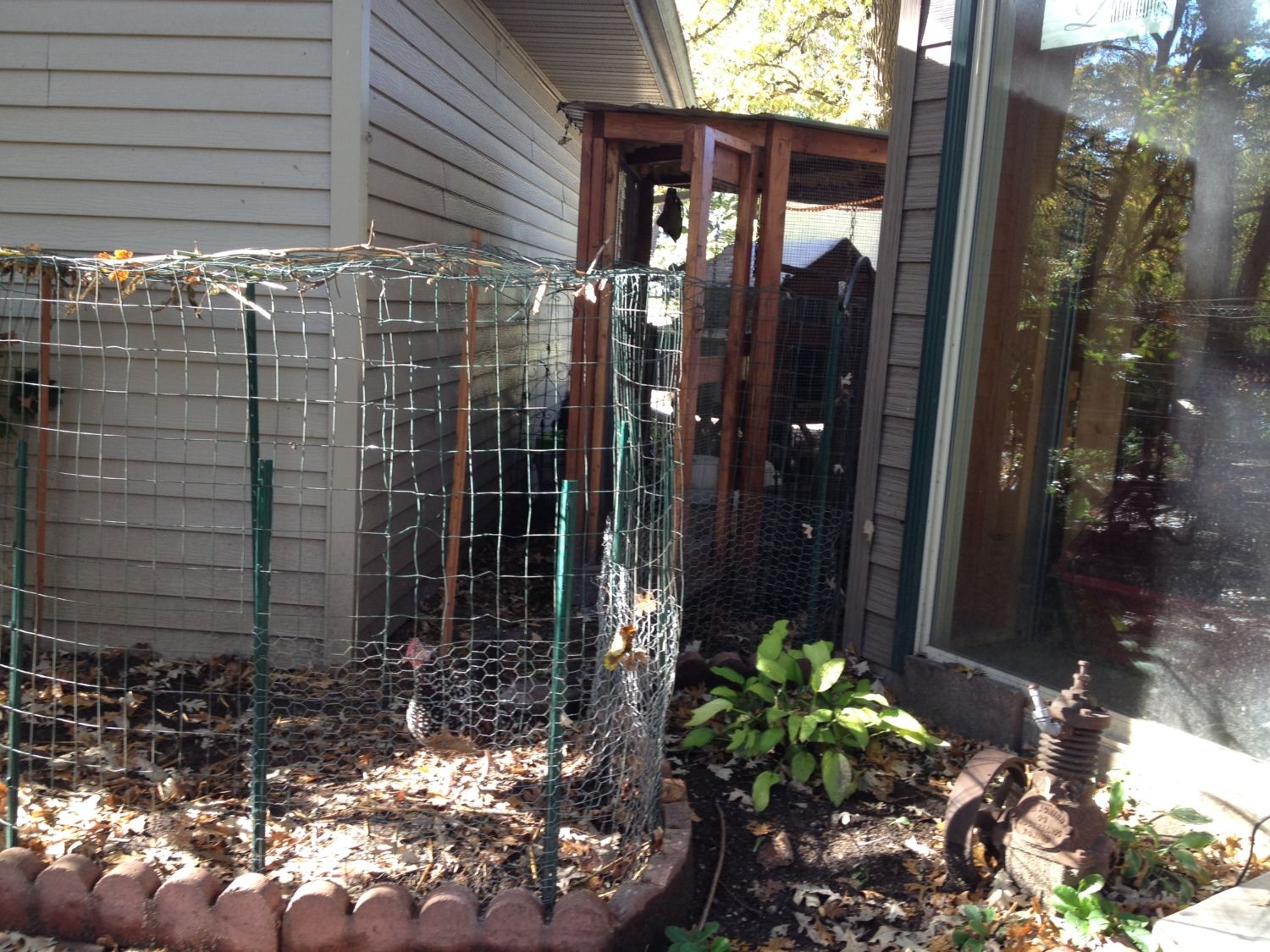 Here we have walked to the back of the coop/run. You see the garage on the left and the two-story shed on the right. So the coop narrows at the back with a latched door into the covered run. I have fenced in a outdoor run just out side that coop door, hence the green stakes. It is covered with wire so that the hens stay in instead of 'flying the coop' and I have tried latching various mediums for a cover but have been unsuccessful thus far in obtaining the look I want.
