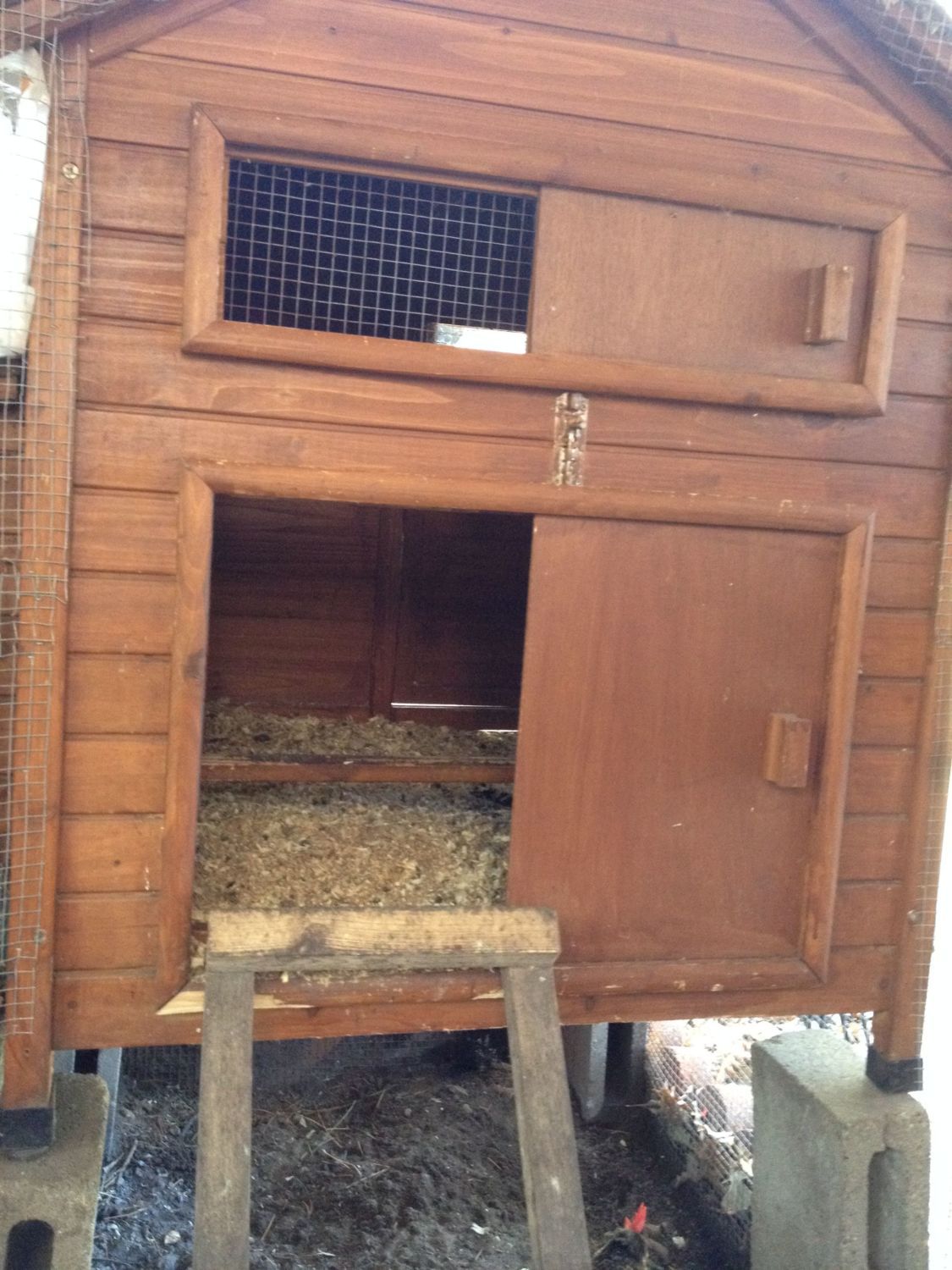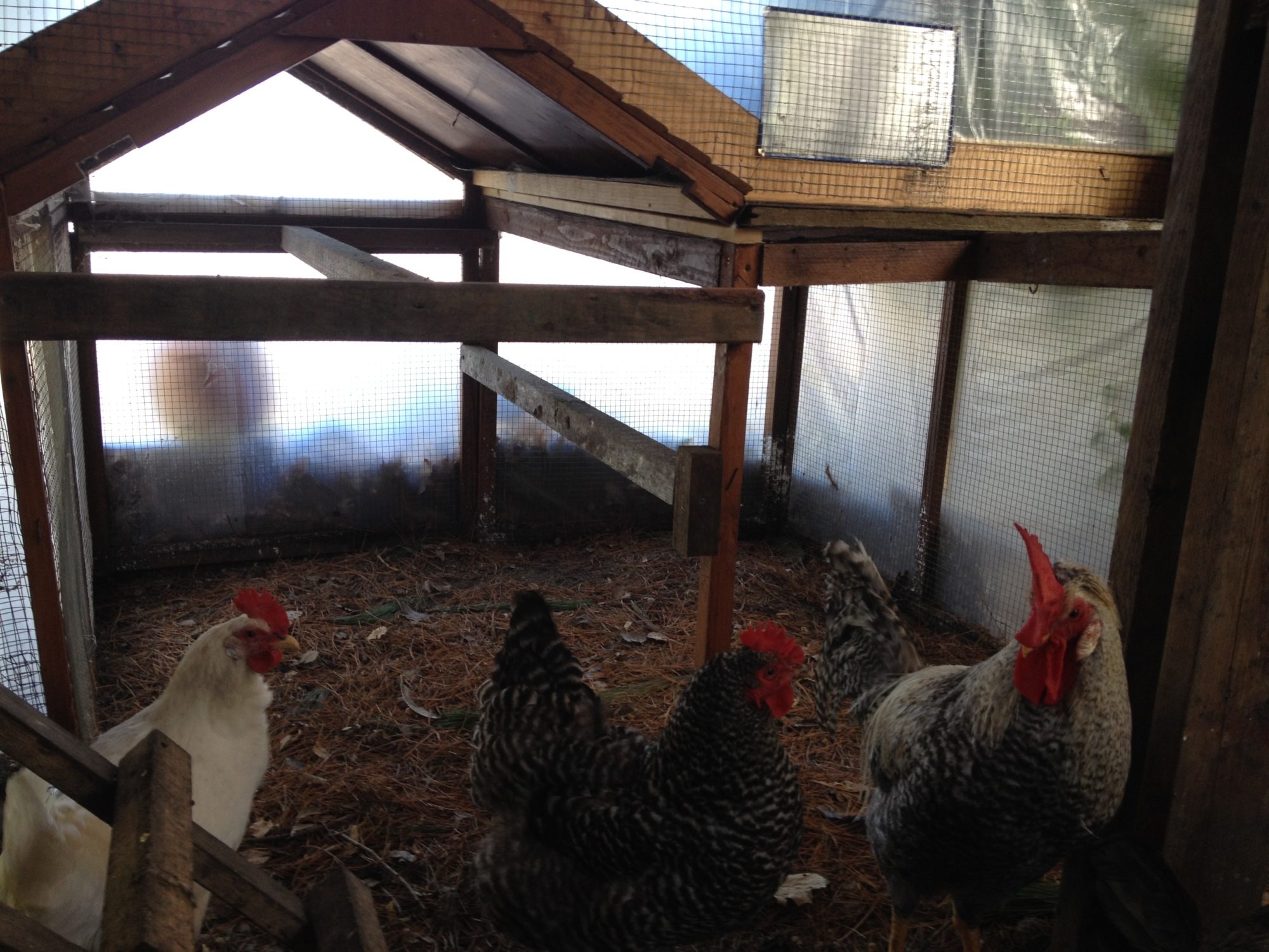 Okay - some (most) of the girls coming to greet me. The second is that front enclosed area where the afternoon sun shines in. It has a dirt floor (as is true of the whole run) and this portion is covered in pine needles which they absolutely love! Then there is the little coop that I use for their convenience of laying eggs in. There are six nesting boxes and they usually use two of them. ????. Whatever. Under it, behind that ladder is the dusting box. It is a mix of black dirt, landscaping sand and ash along with some charcoal.
