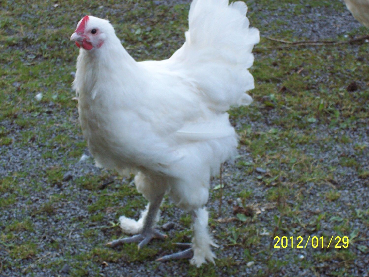 What an improvement they are over their parents!!!! That black must have REALLY infused some good traits! The wings are at an excellent angle and held very tightly. The head on that male! WHEW! The female has a very tight body. Bred to that male though...it'll help loosen up! Excellent leg feathering and good leg coloring! The width of his body is simply breathtaking! The original birds I started with looked more like production Orpingtons with feathers on their legs! What an excellent start on the whites Debi!