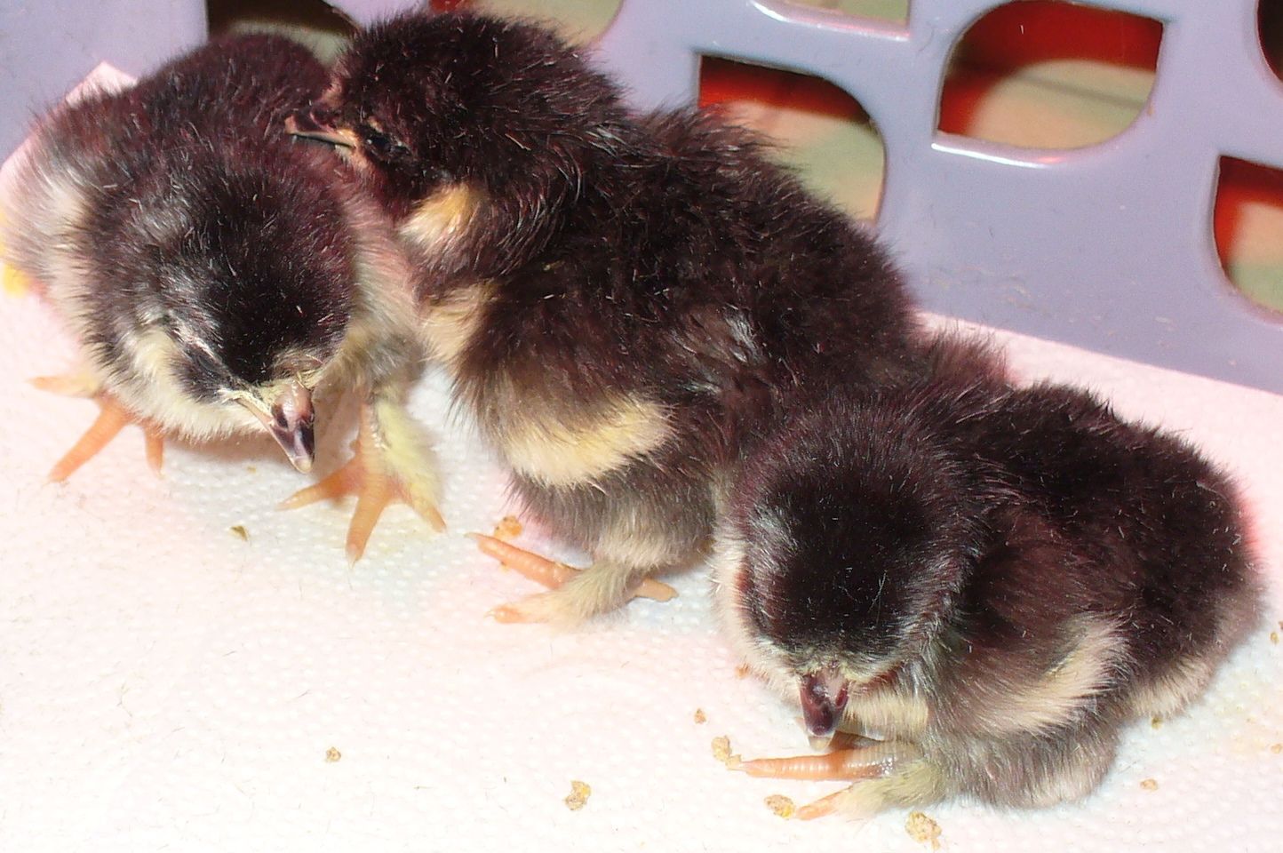 My eggs hadn't hatched by mid-day 23. I saw no more movement in 3 of them, so I egg-topsied them. They were dead and had never turned their beaks up to the air pocket and had small heads, I suspect because the eggs were pretty long and torpedo-shaped. The remaining egg (alive) had it's beak in the air pocket and was breathing. I waited over 24 hours, with nothing. I decided to see what would happen if I opened it's top - helped it pip. It lived, but is VERY VERY small! It's the teeniest chick I have ever hatched! I really didn't expect it to live, and at a few days old it still needs me to dip it's beak in water. I borrowed a 4 day old chick from a friend to be its pal. The 4 day old Polish chick is about 3x it's size! It's eyes seem a little funny to me, but it isn't blind. Everyday it gets a little stronger. Right now, it's probably about where it should have been (strength wise) at birth. I was really hoping to hatch a mammoth Langshan rooster, but I have a feeling I have a little runt on my hands! I'm sure I shouldn't have helped it out, I'm sure you will all tell me I should have let it be, but I didn't, and here we are, time will tell...
