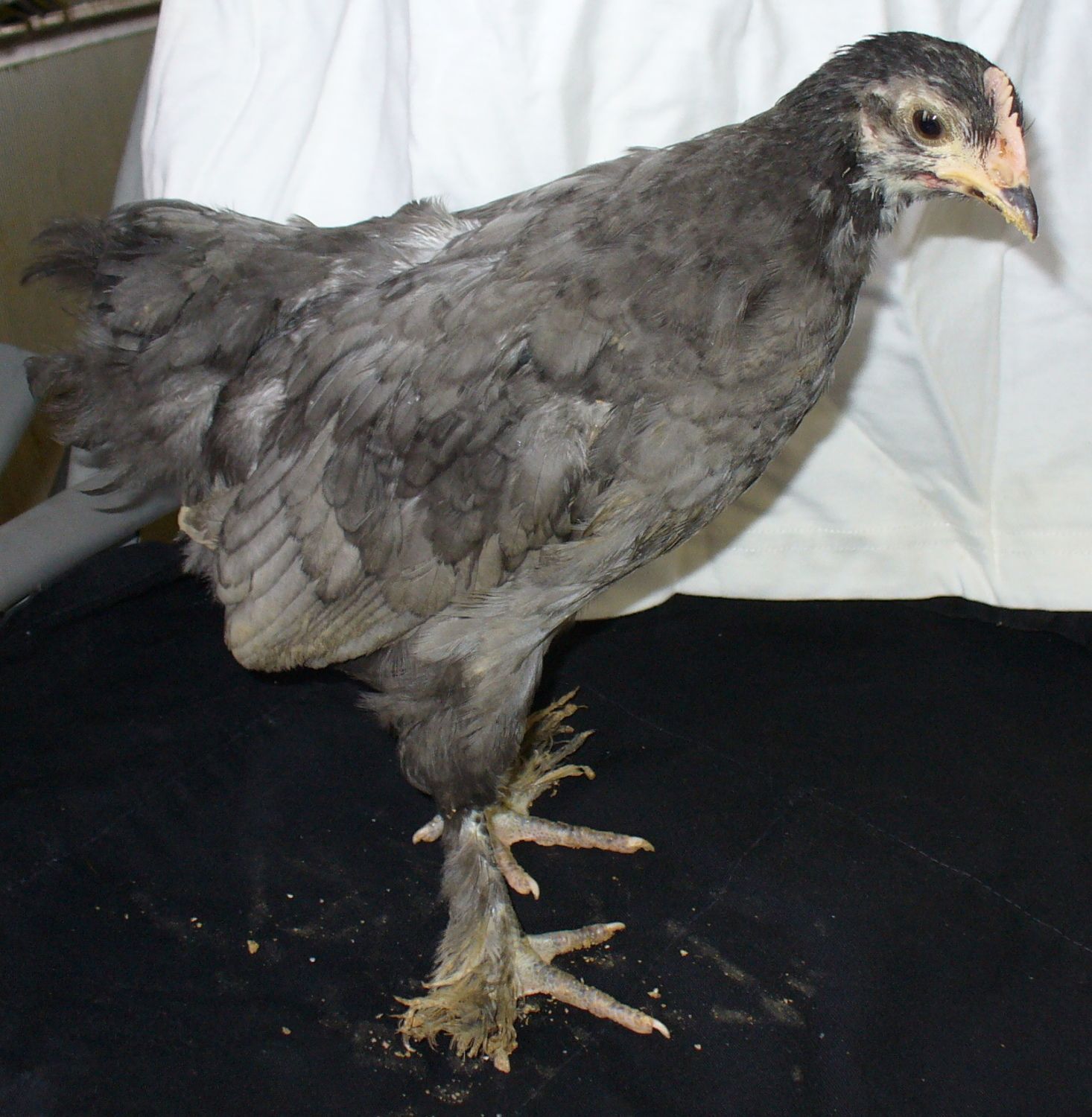Pullet. Of course, I like my Langshans on the darker side. She has ok leg feathering. Does she show any feathers on her middle toes? I am not a fan of her head. It looks a bit small in width.