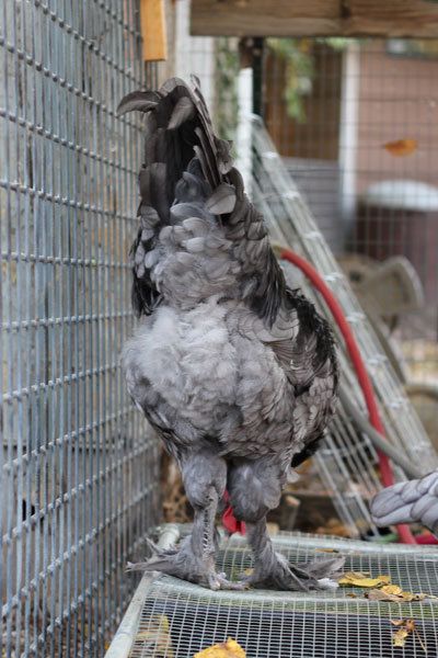 Ok, for fun I snapped a few more pics of Thor and the blue girl with the cushion. They are both just over 28 weeks old and were broody raised so not handled very much. I keep looking at the girl because sometimes she looks like she has the cushion and sometimes she doesn't. I noticed today that I make her very nervous especially when I have the camera and she keeps her tail down which shows the cushion. But when she is far enough away from me, her tail comes up and the cushion disappears. She does seem to be on the small side so would she be a negative for breeding due to the sometimes cushion as well as her size? Just trying to decide whether to keep her with my layers or move her to the farm with Thor.