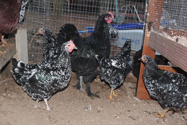 Just for fun, here is a pic of one of my young Langshan pullets surrounded by Pita Pinta pullets. They are all around the same age. The Pita Pintas are normal sized large fowl and my Langshan are giant sized fowl!