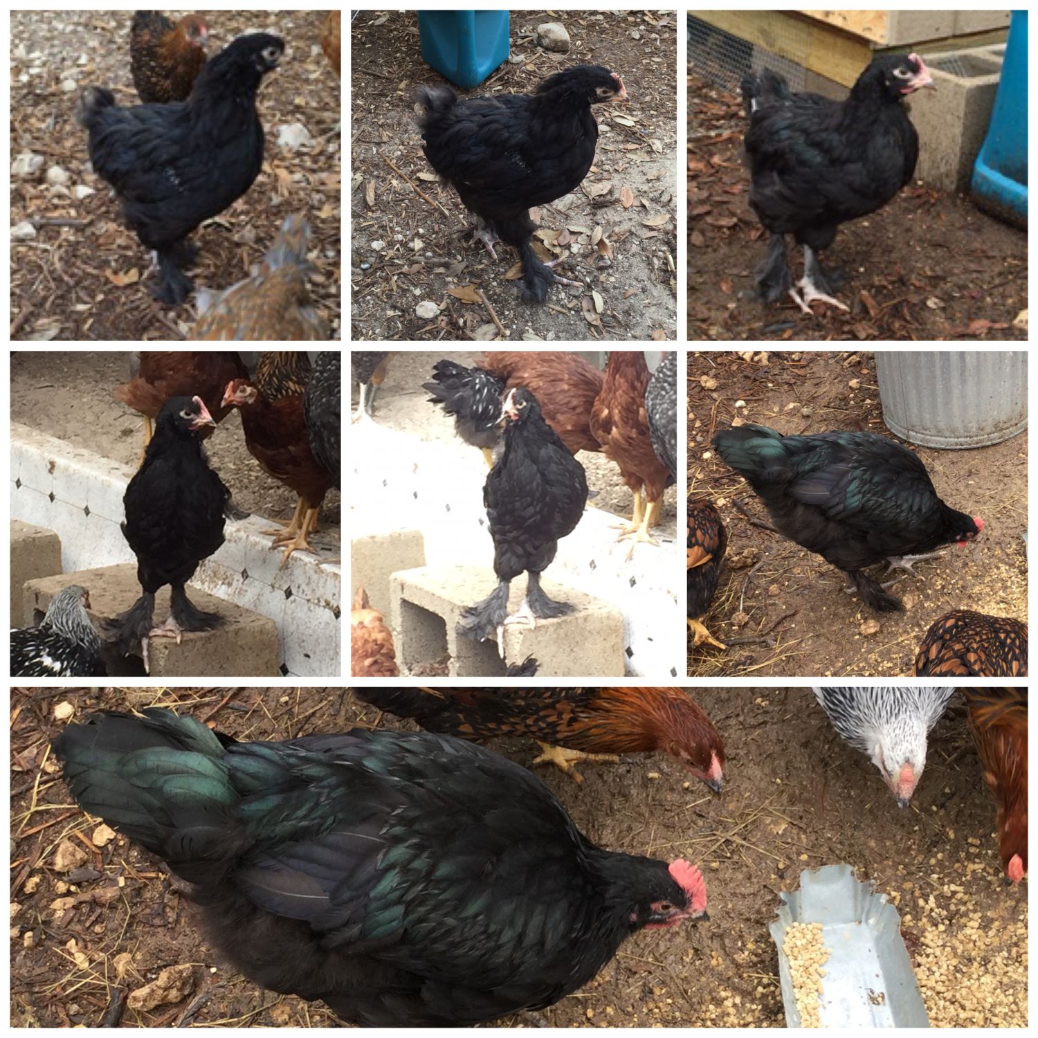 Can anyone confirm that this is a Langshan? It was my free "rare bird" from McMurry. I thought it was a rooster because the comb is so defined, but at 4 months old, I see no tail feathers and one of my other Hens turned out to be a Henry and has been very vocal this week while this one has not at all. Also, even though bigger than everyone else, it still get bossed around and its poor feet feather are always a temptation for plucking by the other chickens!