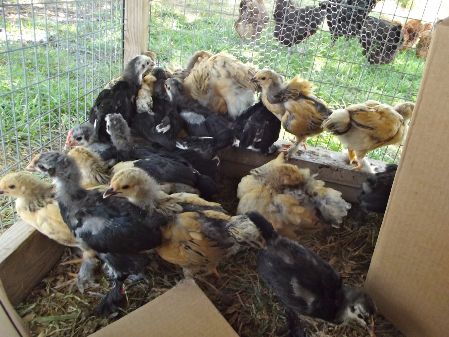 The Blacks are my Langshans & the Buffs are my Brahmas both are standard Sized for their breeds,they are all 6 Weeks old how-ever they where only 4 Weeks/1 Month old in this pic.