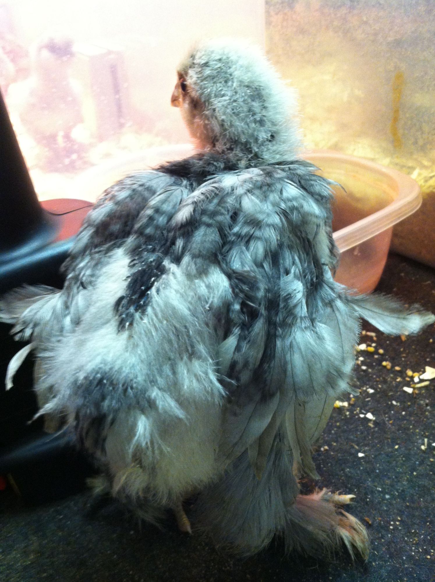This is my first time hatching out LF Cochin chicks. Out of 8 chicks, I have one that is about 1/3 the size of its hatchmates. The feathers on the little guy are also doing something weird. About half way down the feather there is a little break in the feather and the last half of the feather then twists out from the body in all directions. I checked with the person I bought the hatching eggs from and she only has LF Cochins and has no idea where this little one came from. The chick is six weeks old.