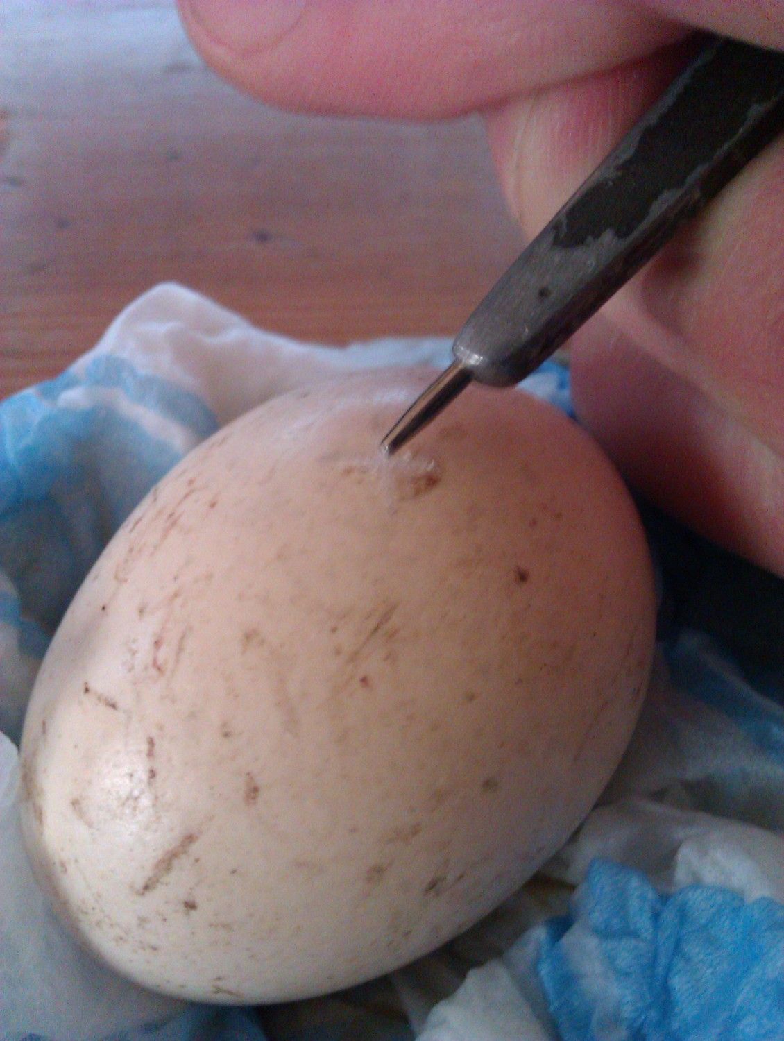 I candled the egg to see where the chicks' beak was positioned and drew a X there so I could create a piping hole.