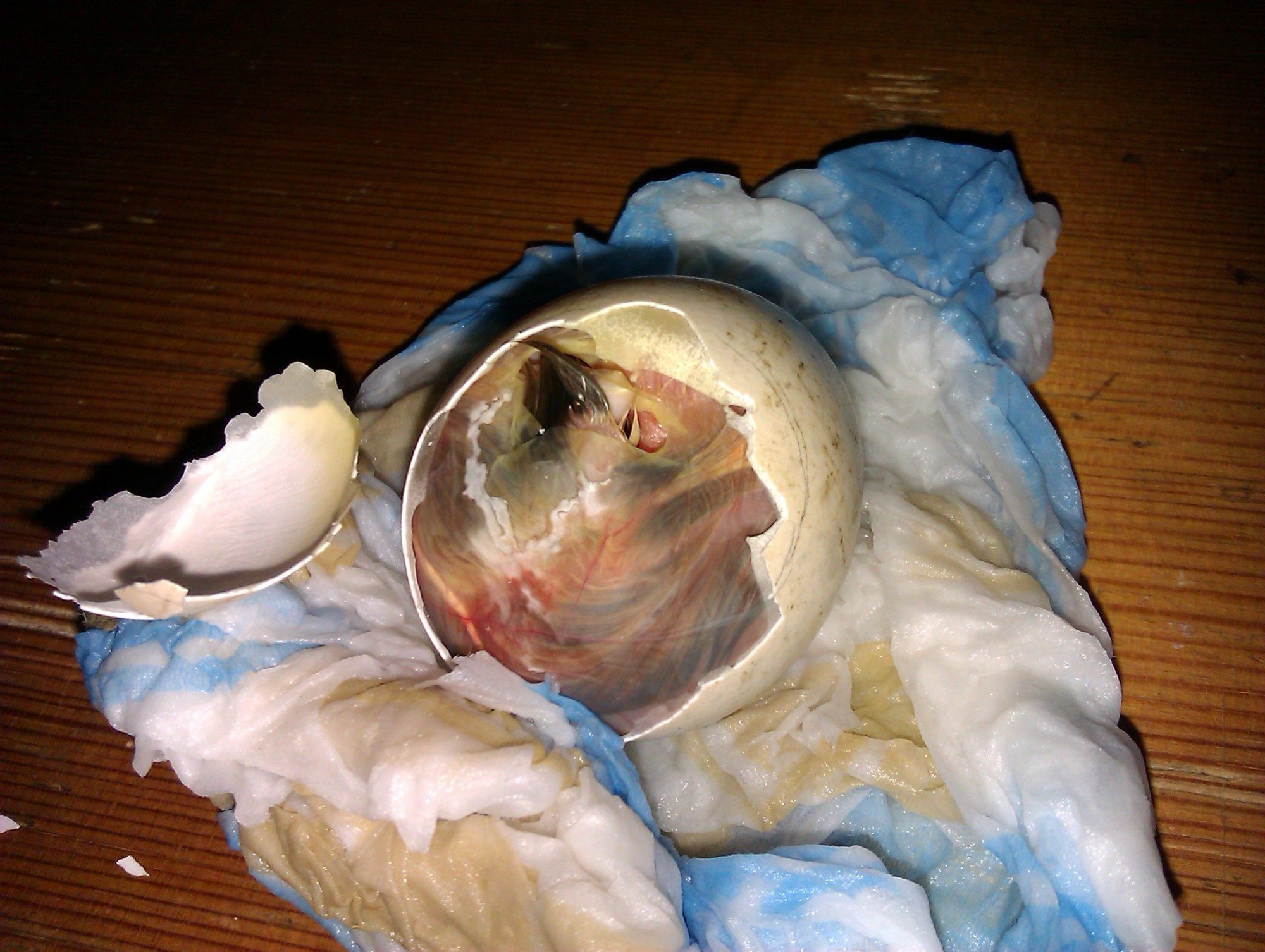 As soon as I removed the membrane it's wing popped out. Soon one of its legs also started emerging. I noticed that over its head I had still left a rather large piece of shell that prevented its head from getting out so I removed that little bit of shell and the chick almost popped out in my hand.